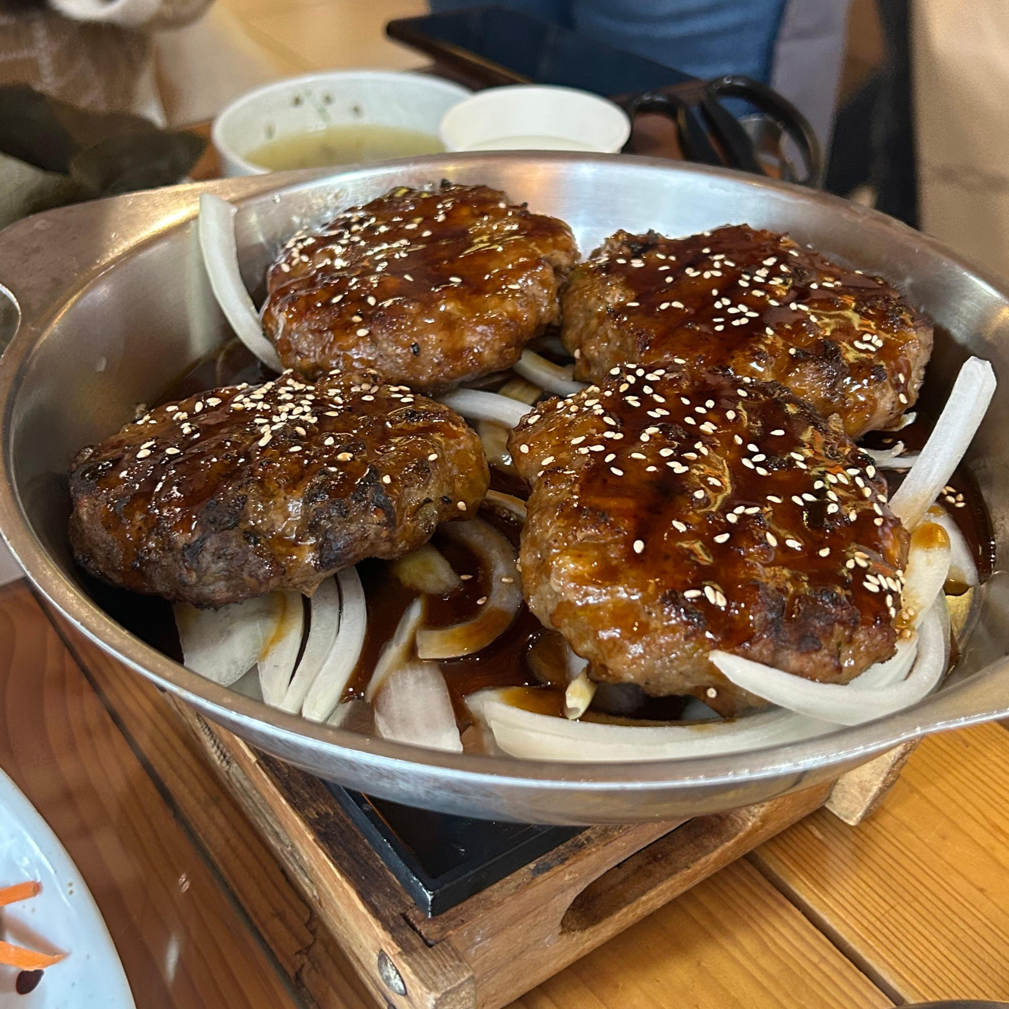 도란도란 모여있는 떡갈비 4장입니다. 모든 메뉴에 떡갈비가 1장씩 꼭 포함이 되어 있어서 싸우지 않고 모두가 한 장씩 먹어볼 수 있어서 좋았어요. 떡갈비 자체는 거의 모두 조리된 상태로 왔는데, 이제 양파가 익어야 하고 추가된 양념이 베어들어야 하는 시간이 필요하여 떡갈비를 철판에 올려서 가져다주었습니다. 그리고 그 철판 아래에는 촛불? 석탄 불? 같은 것을 지펴주었어요. 캠핑에서 많이 쓰는 것 같은 것으로 화력이 꽤나 셌습니다. 그렇게 자글자글 양파가 투명할 정도로 익었을 때, 떡갈비도 먹을 수 있었습니다.