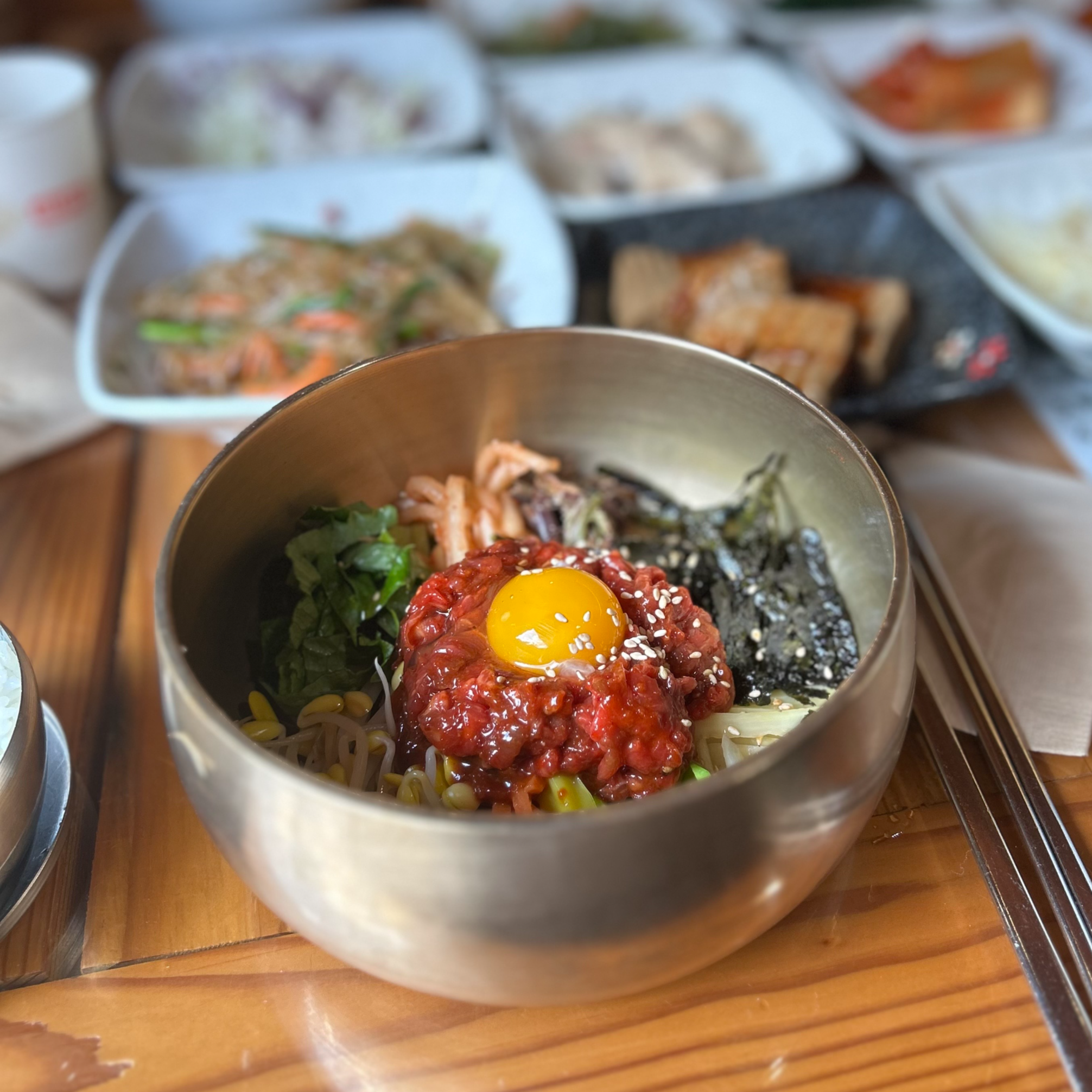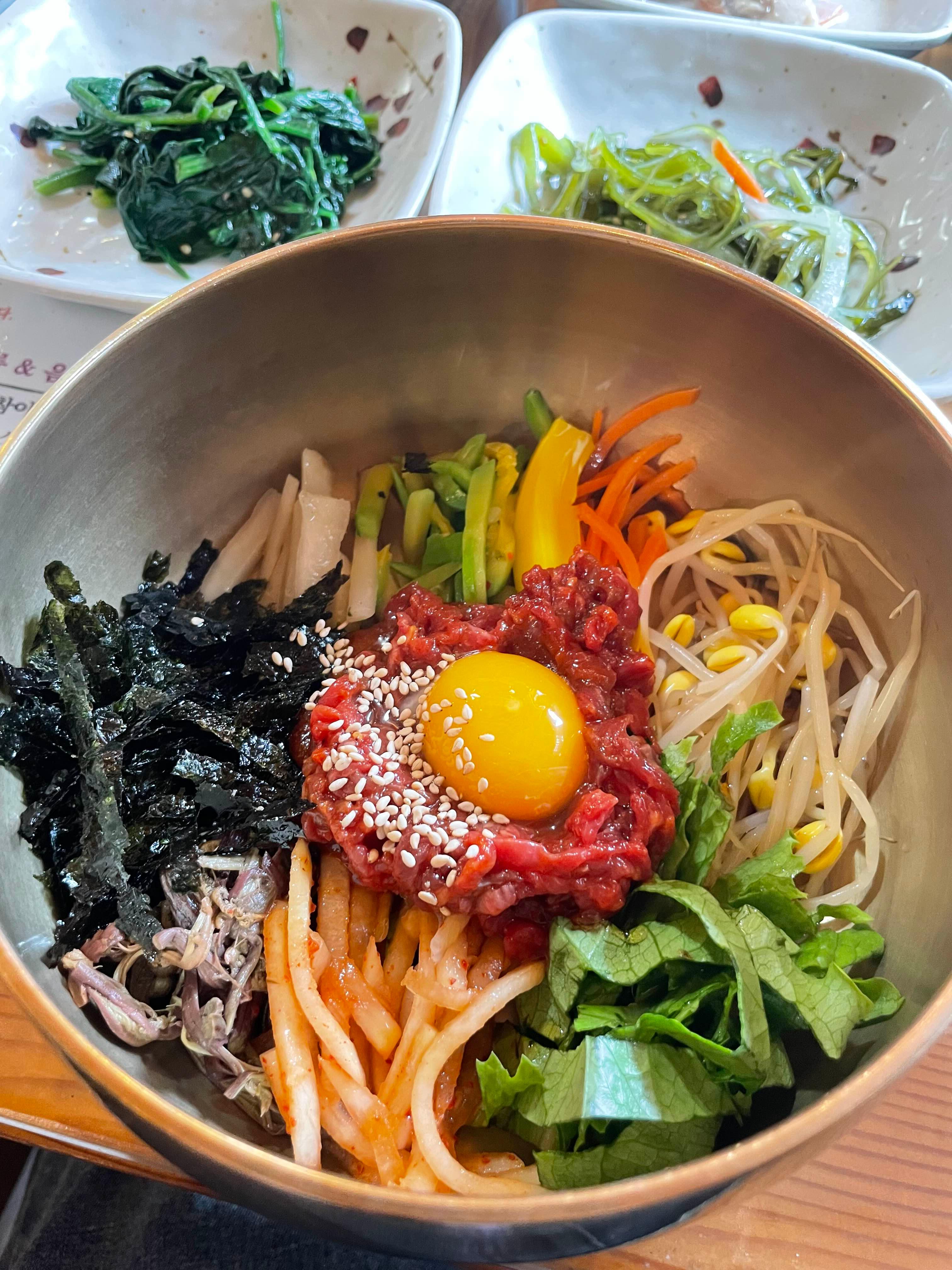 진짜진짜 맛있었었던, 육회비빔밥입니다. 물론 배도 많이 고팠고, 여행 첫 끼이기도 해서 더 맛있게 느껴졌을 수도 있는데 기본적으로 양념이 맛있었고, 나물의 조화가 딱 알맞게 좋았어요. 간이 딱 맞았다고나 할까요.