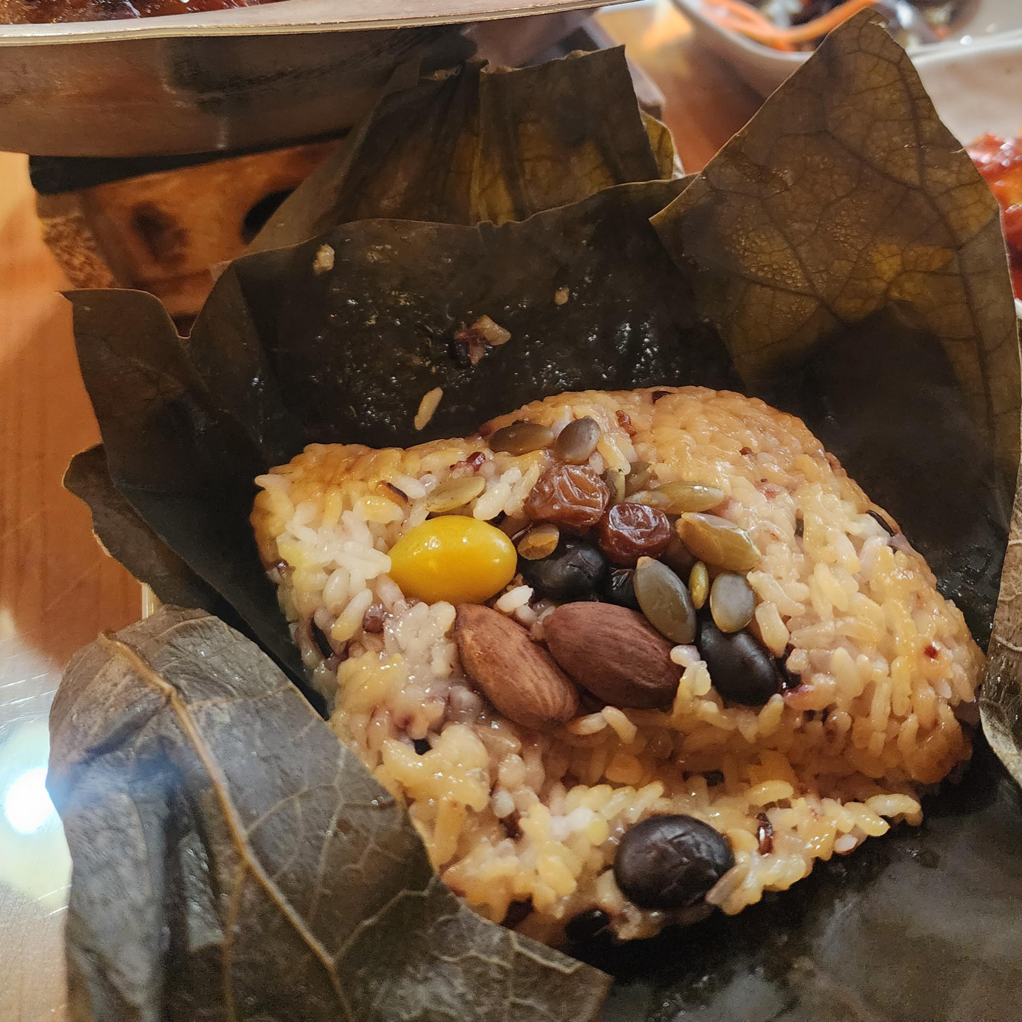 이건 연잎밥입니다. 4명이서 먹을 때 한 친구가 본인은 연잎밥도 먹어보고 싶다고 하여 고르게 된 메뉴예요. 저의 육회 비빔밥을 조금 덜어 주고 연잎밥을 조금 얻어 와 먹어 봤습니다. 굉장히 향기롭고 밥이 찰졌어요. 쫀득쫀득한 식감이 약밥 느낌이 났습니다. 그런데 이제 약밥보다는 조금 덜 단 느낌이라 맛있게 먹을 수 있었습니다. 한방 향이 맛있게 나서 식용을 돋워주는 느낌이 들었어요. 둘 이상 식사하러 오셨다면, 이 연잎밥도 색다른 느낌으로 추천! 할 수 있을 것 같습니다.