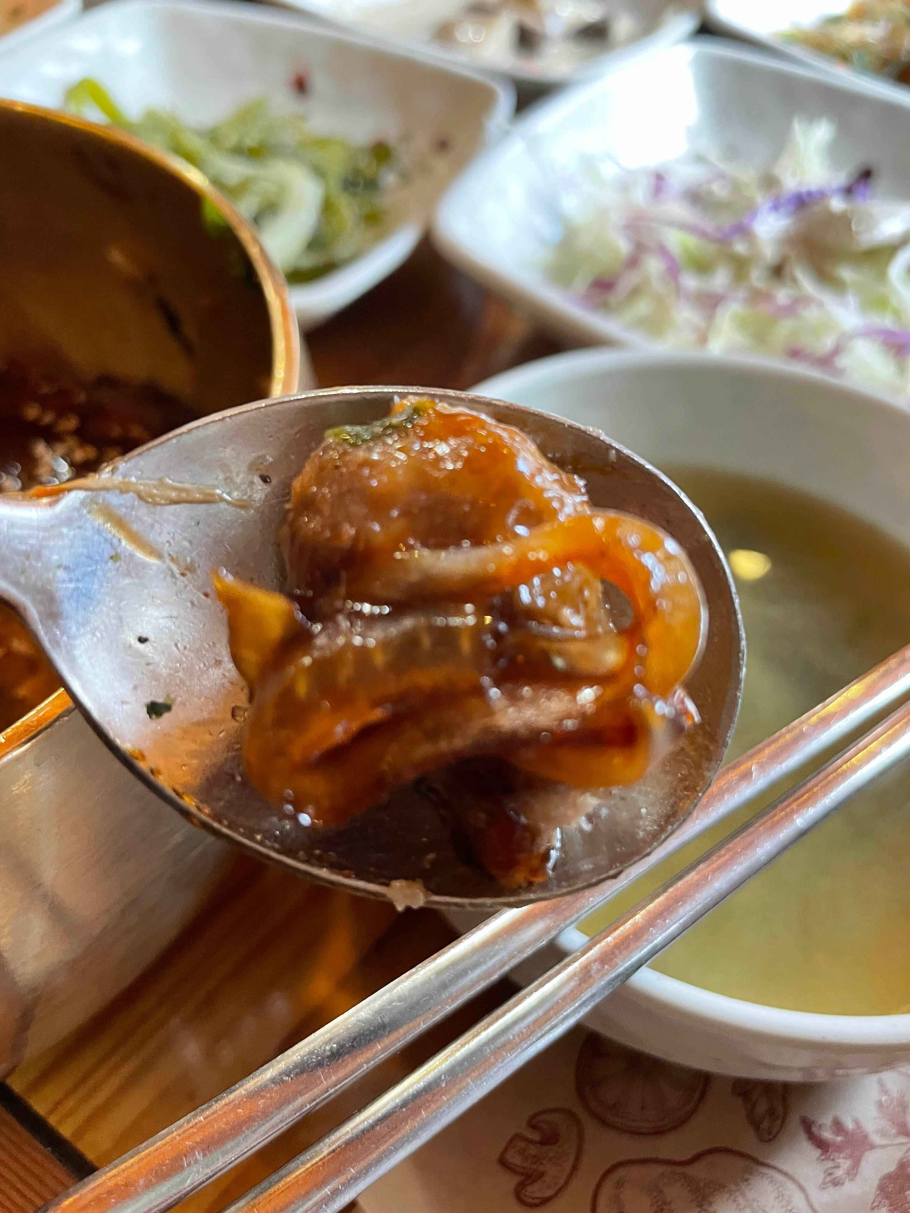 수제 떡갈비라고 하던 이 친구, 맛이 꽤나 좋았습니다. 간도 적절해서 밥이랑 같이 먹기에도 좋았고, 씹히는 것도 많아서 식감도 좋았어요. 떡갈비 양념에 같이 졸여진 이 양파! 이 친구의 존재감도 대단했습니다. 양파의 단맛이 간장의 짠맛과 어울어져서 단짠의 조화를 잘 유지하고 있었어요. 그래서 떡갈비의 식감에도 영향을 주면서 맛있게 먹을 수 있었습니다.