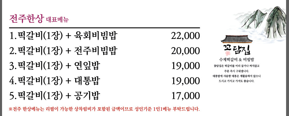 메뉴 사진을 찍지 않았더라고요. 몇 달 지난 시점이지만 당시에 먹었던 가격과 동일하니 참고해주세요. 모든 메뉴에 떡갈비가 1장씩 포함되어 있었습니다. 사실 <꽃담집>을 고른 이유 중 하나이기도 해요. 저희는 떡갈비도 먹고 싶었고, 비빔밥도 먹고 싶었거든요.