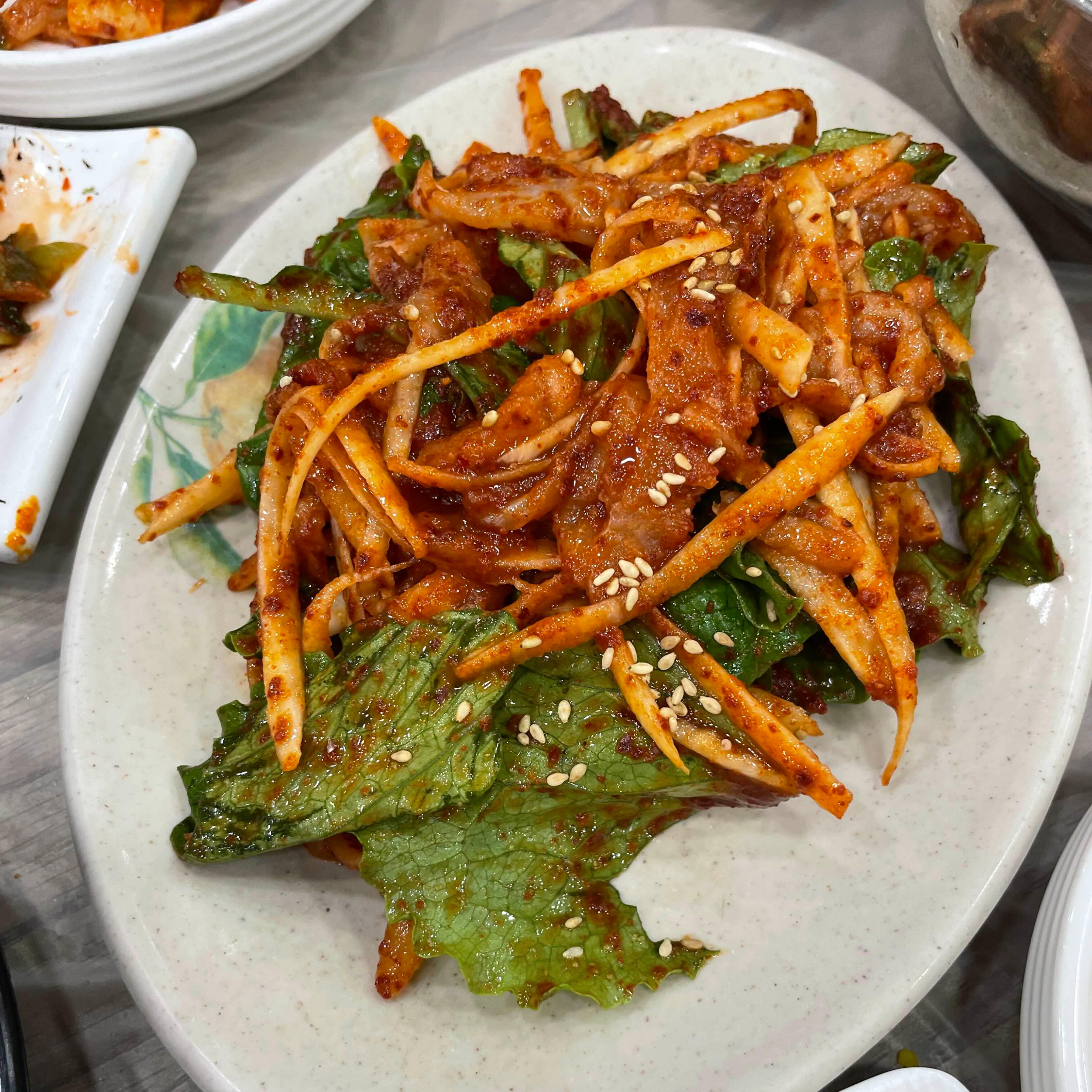메인 메뉴인 삼치회입니다. 굉장히 두툼하고 신선해서 맛이 좋았어요. 삼치회는 이번에 처음 먹어봤는데, 식감이 굉장히 좋았습니다. 두툼해서 더 그랬던 것 같기도 하고요. 저 인삼(?) 같은 거에는 관심이 없어서 아빠 드렸습니다.