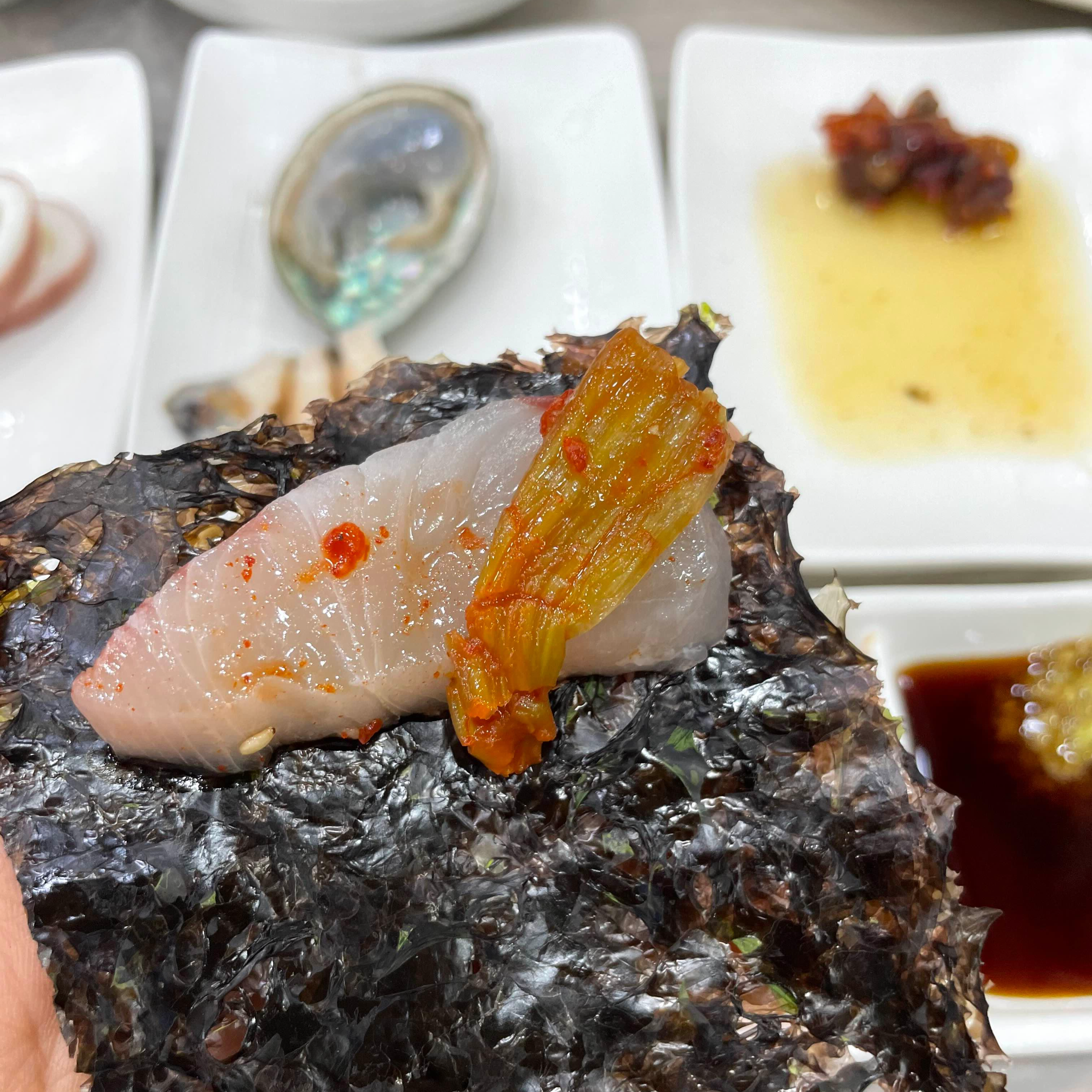 삼치회는 이렇게 김에 먹는 것을 추천해주시더라고요. 김도 이 가게에서 직접 공수하는 거라고 하셨던 것 같습니다. 그래서 그런지 김이 굉장히 두껍고 김 맛도 좋았어요. 흐물텅하고 얇은 그런 김이 아니더라고요. 김 한 장에 삼치회 한 점 그리고 갓김치 조금을 넣어서 쌈을 만들어 먹으면 조합이 아주 좋았습니다. 느끼할 수 있는 삼치회의 맛을 갓김치가 잡아주고, 김을 통해서 담백하게 즐길 수 있었어요.
