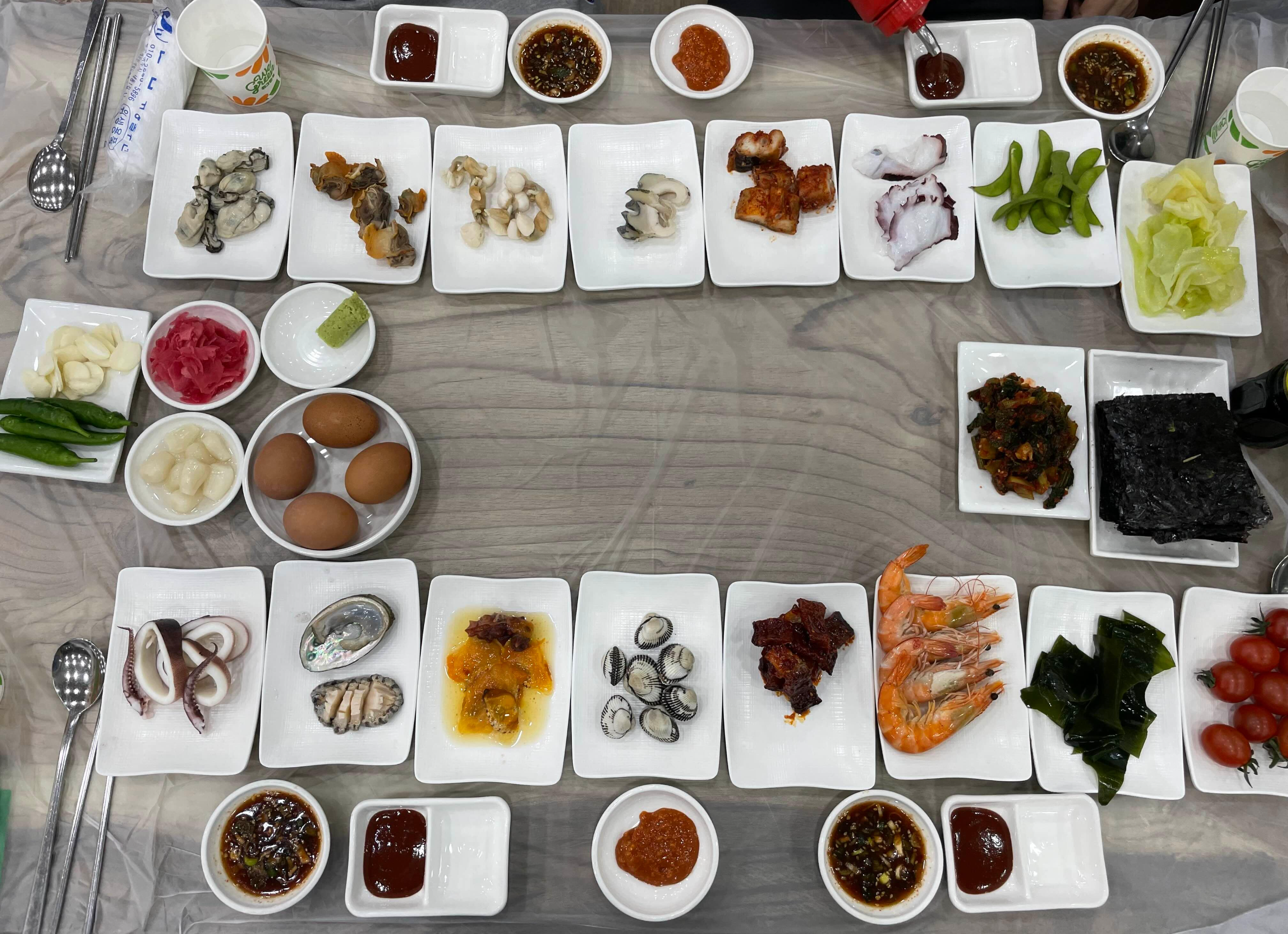 삼치회 정식 4인입니다. 아래는 회가 나오기 전 스끼다시에요. 배가 굉장히 고팠는데, 회가 나오기 전 기본 반찬으로 나오는 것들이 이렇게나 많은 것을 보고 굉장히 놀라웠습니다. 그리고 이렇게 나오는 것들이 어떤 가게에서는 크게 맛이 좋지 않았던 경험도 있었어서 의심 가득한 눈빛을 하며 먹어봤는데요. 맛있었습니다. 반찬들이 모두 신선하고 맛이 좋았어요. 그래서 메인 메뉴가 등장하기 전부터 기분 좋게 배를 채울 수 있었습니다.