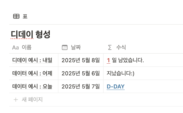 수식이 올바르게 입력이 되고, 작업중인 데이터베이스 내의 속성도 잘 불러왔다면 아래와 같이 표현되는 것을 볼 수 있습니다. 앞서 말씀드렸듯이 각 D-Day 를 표현하는 방법은 무궁무진하니까요. 각자의 스타일과 취향에 맞춰서 수식을 꾸며주면 개인 맞춤형 "D-Day"를 만나볼 수 있을 것 같습니다:)