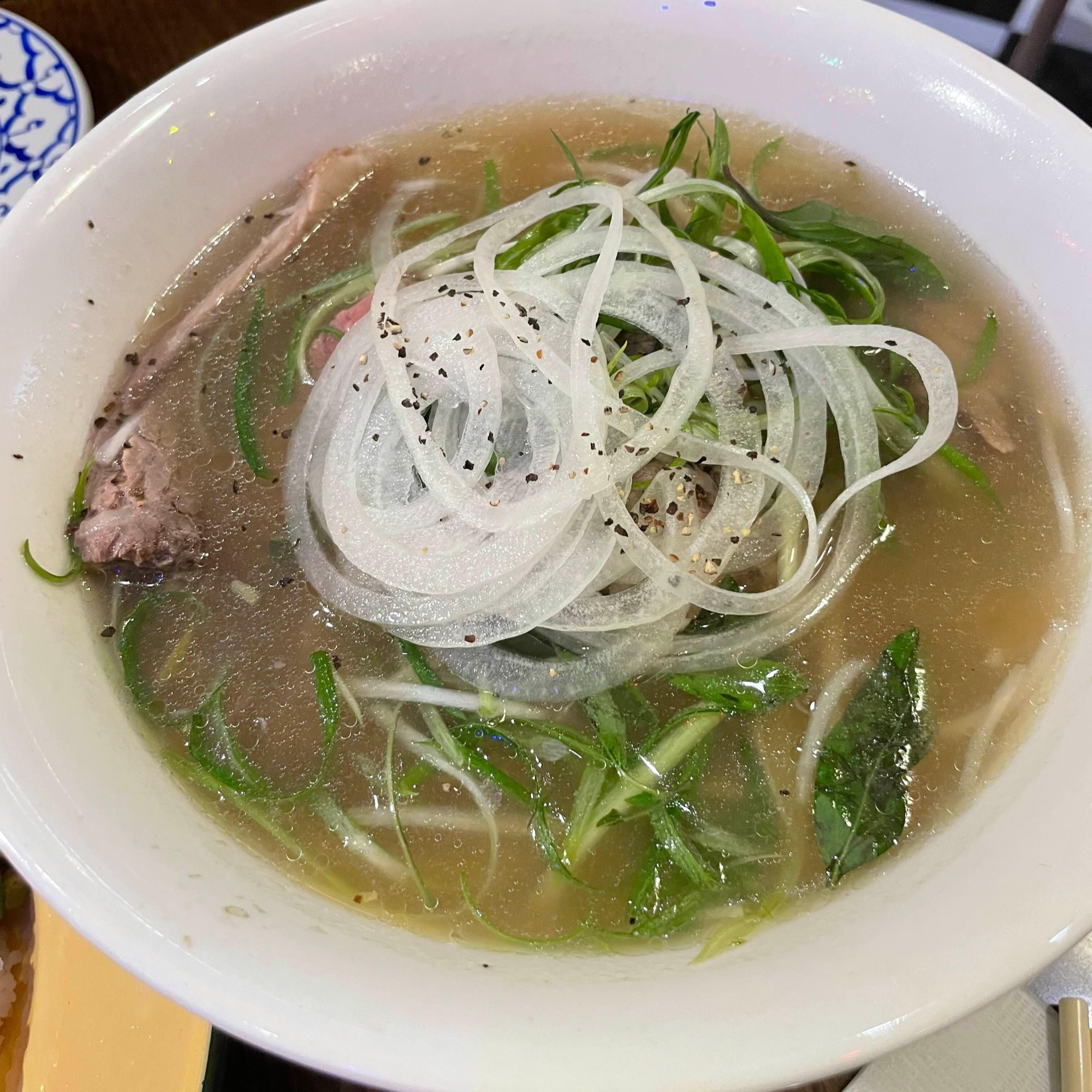 그리고 원래 목적이었던 뜨거운 국물을 먹어야 하는 강렬한 의지와 기본을 먹어봐야 이 집이 진정한 맛집임을 알 것이라는 의견이 만나, 소고기 쌀국수를 시키게 되었습니다. 소고기 쌀국수는 참 맛있는 것 같아요. 돼지고기 덮밥의 슴슴함을 고기 국물로 삭 넘기면서 같이 먹으니까 시너지가 좋았어요. 소고기 쌀국수의 매력이죠. 국물이 깔끔해서 먹기 좋았습니다. 고수 향이 조금 났는데, 물론 고수를 빼달라고 했던 것 같지만, 그래도 향이 조금 났어요. 그래도 저는 요즘 조금 익숙해져서 먹기 나쁘지 않았습니다. 맛있게 먹었어요.