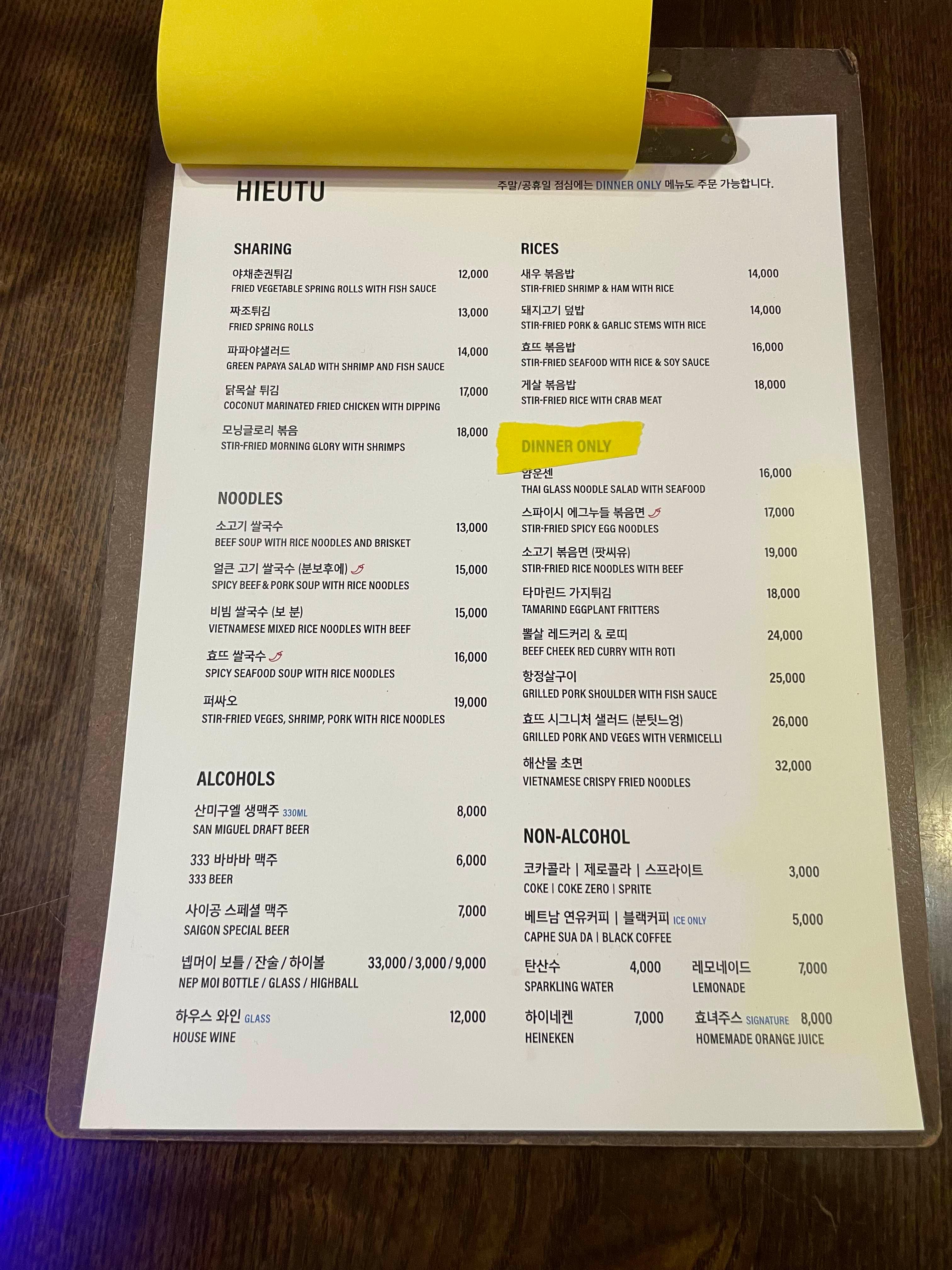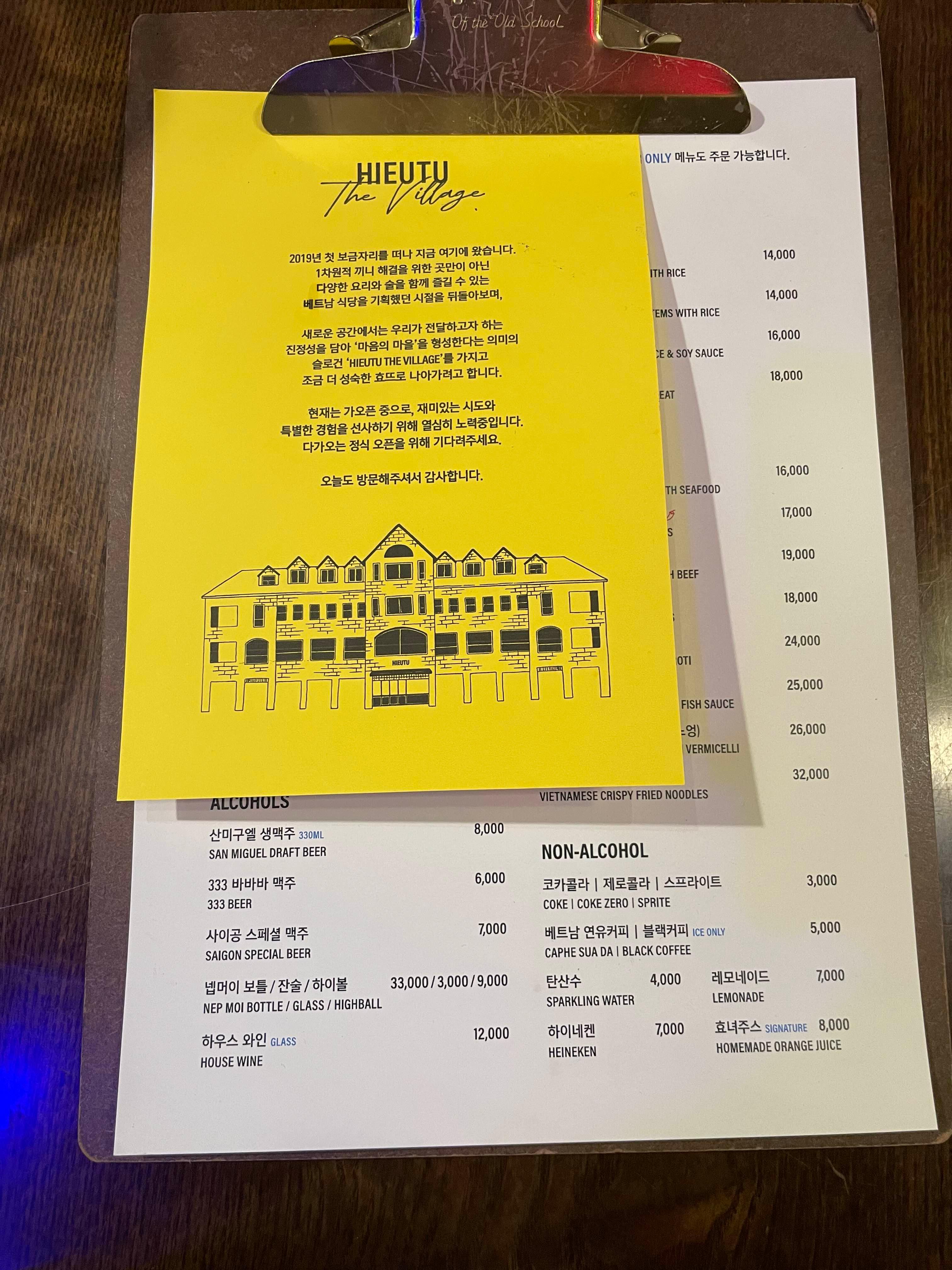 입장 알림을 받고 매장 내부로 들어서니, 다음과 같이 메뉴판이 놓아져 있었습니다. 이런저런 오픈 환영 인사와 실제 메뉴를 확인해 볼 수 있었어요. 가오픈이라 그런지는 몰라도 감성 어린 문구가 눈을 사로잡았습니다. 효뜨의 사훈을 읽어보며, 메뉴판을 정독했어요. 굉장히 다양한 메뉴가 있었습니다. 그리고 가격도 꽤 세다는 생각이 들었어요. 기본 쌀국수가 13,000원이라니, 용산의 월세와 유명한 맛집이라는 점을 감안해야 한다고 무한히 생각했습니다.