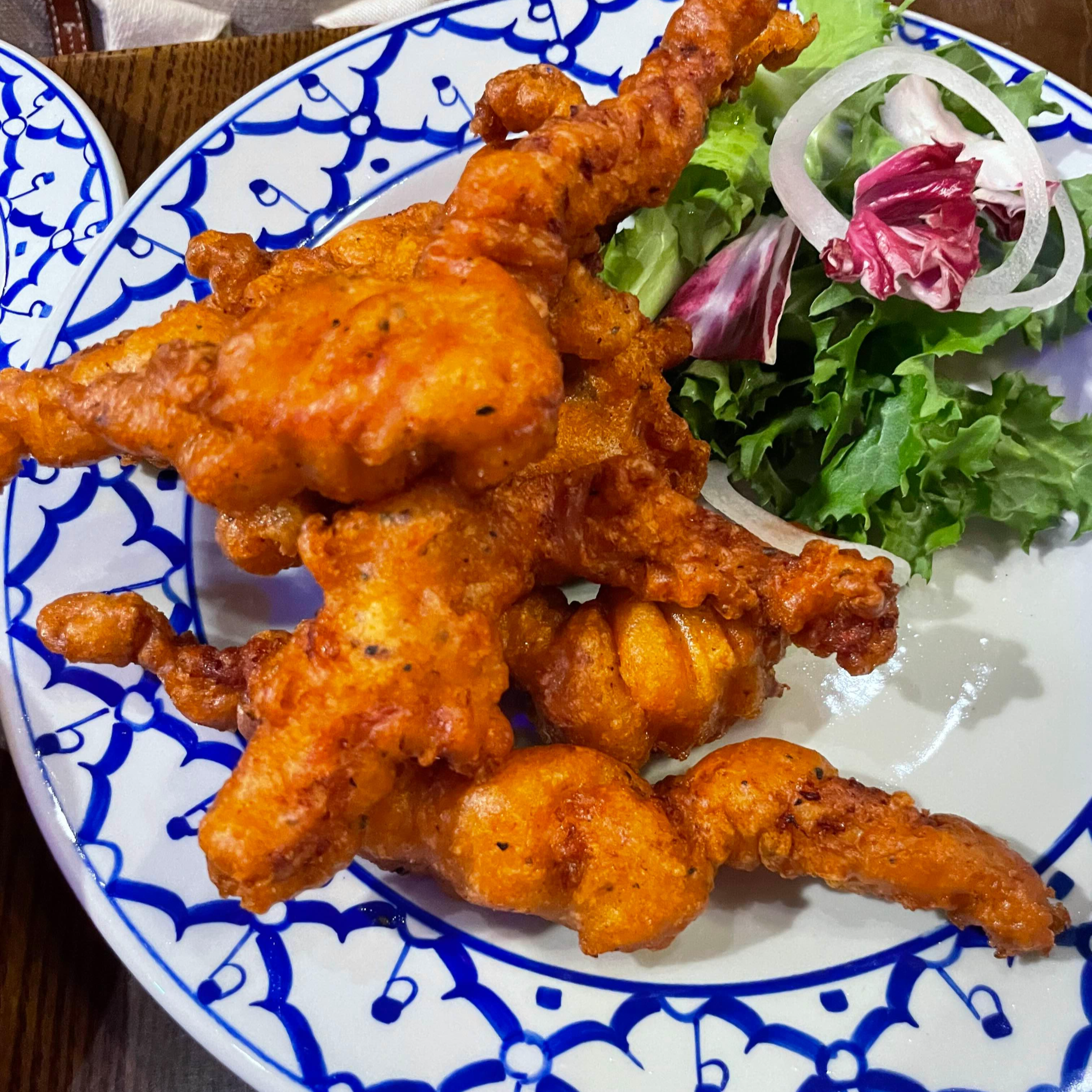 개인적으로 제일 맛있게 먹은 메뉴입니다. 닭목살 튀김인데요. 솔직히 간이 좀 많이 세기는 했는데, 갓 튀긴 튀김의 뜨거움과 바삭함과 닭목살의 쫄깃한 식감이 만나서 정말 맛이 좋았어요. 곁들임 채소들이 아무 간이 되어 있지 않았는데, 닭목살 튀김의 센 간을 맨 채소와 함께 먹기 위함이 아니었을까 싶을 정도로 잘 어울렸습니다.