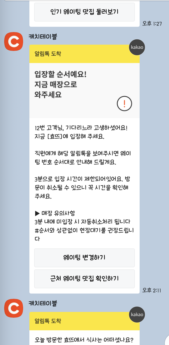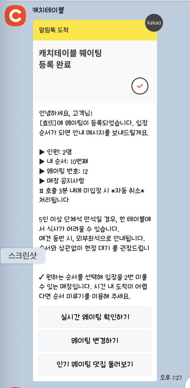 웨이팅은 매장 앞의 캐치테이블로 진행했습니다. 원격 웨이팅이 되었었는지 지금 잘 기억은 안 나는데, 제 기억으로는 모두가 방문해서 직접 매장 앞에 있는 키오스크를 통해서 웨이팅을 걸었던 것으로 보아, 원격 웨이팅이 없었던 것 같기도 해요. 지금은 또 모르겠지만요. 아무튼 캐치테이블 어플로 웨이팅이 진행되고, 저는 오후 1시 27분에 10번째 순서를 받았고, 오후 2시 11분에 입장했습니다. 대략 40분 정도 기다렸네요. 당시에는 날이 좀 추웠어서 40분 보다는 더 오래 기다렸던 것 같은데, 시간이 말해주니 딱히 할 말은 없군요..!