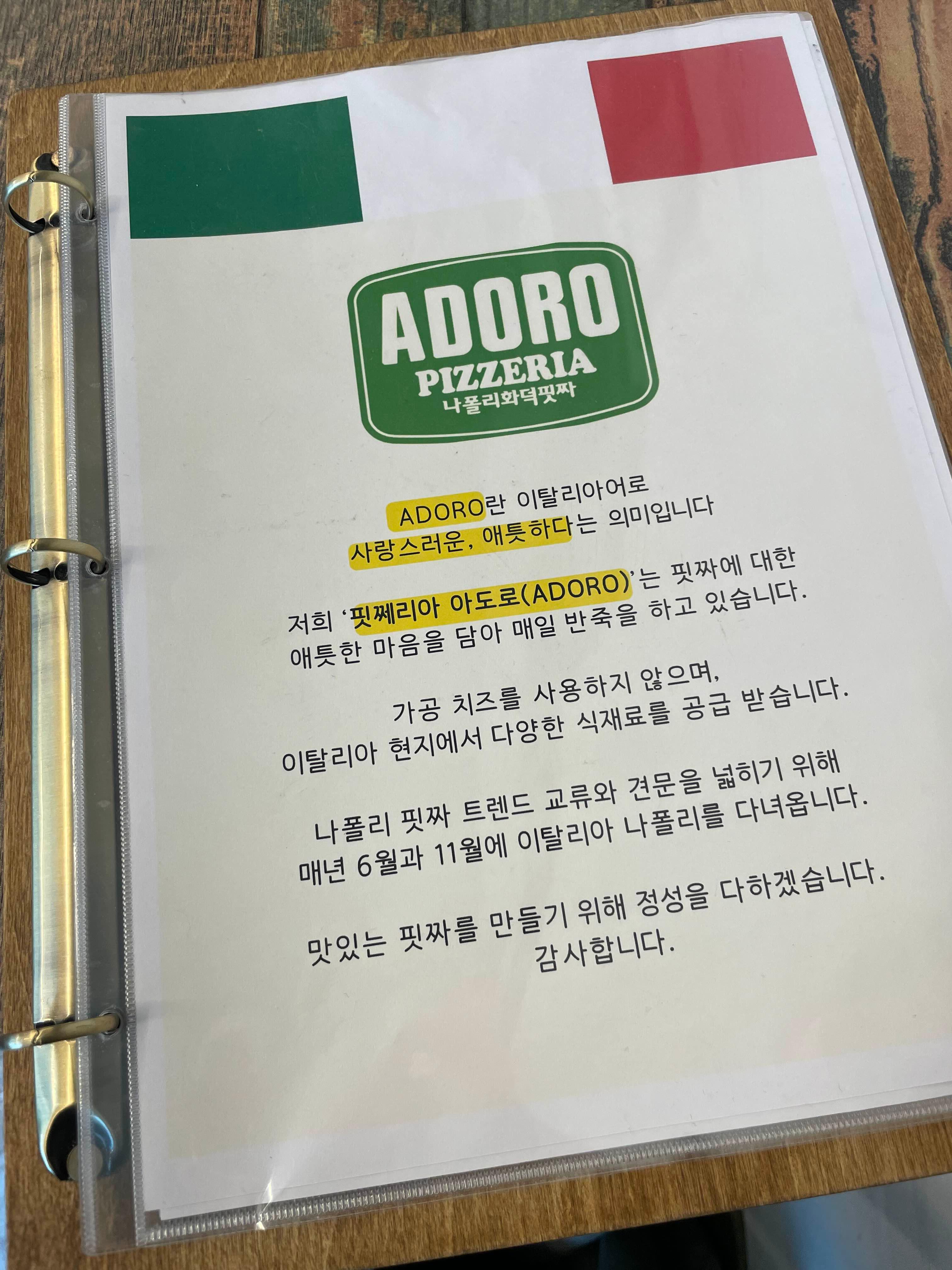 가게 상세 페이지와 메뉴판에도 나오지만, 이곳 <핏제리아 아도르> 는 매년 6월과 11월에 이탈리아 나폴리에 다녀오신다고 합니다. 이 때 대회가 열린다고 하는 것 같았어요. 그래서 제가 방문한 시기도 이탈리아로 떠나기 하루 전 날 가게 문을 열어주셔서 다녀올 수 있었답니다. 그렇기 때문에 <핏제리아 아도르>에 방문할 예정이라면, 꼭 가게 문이 열렸는지 일정표와 미리 전화를 통해서 확인 후 다녀오시길 추천드려요:)