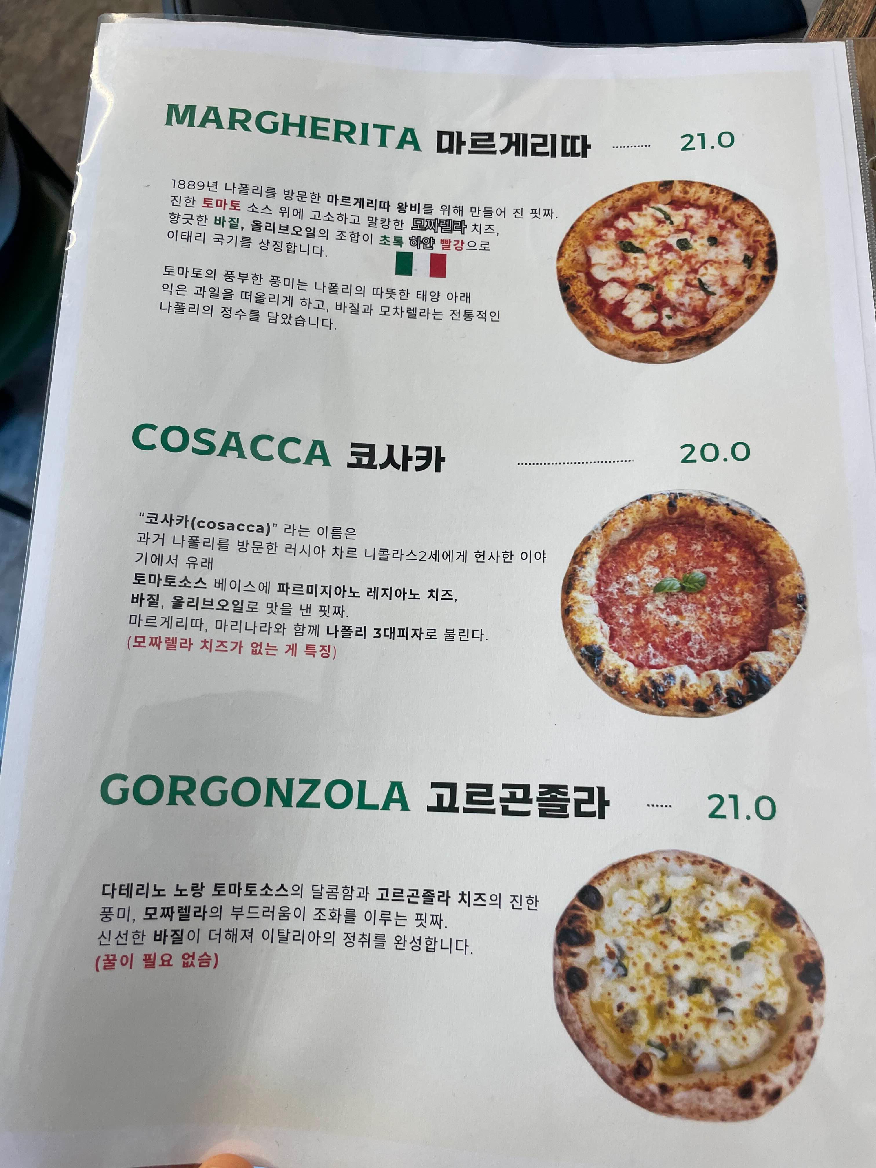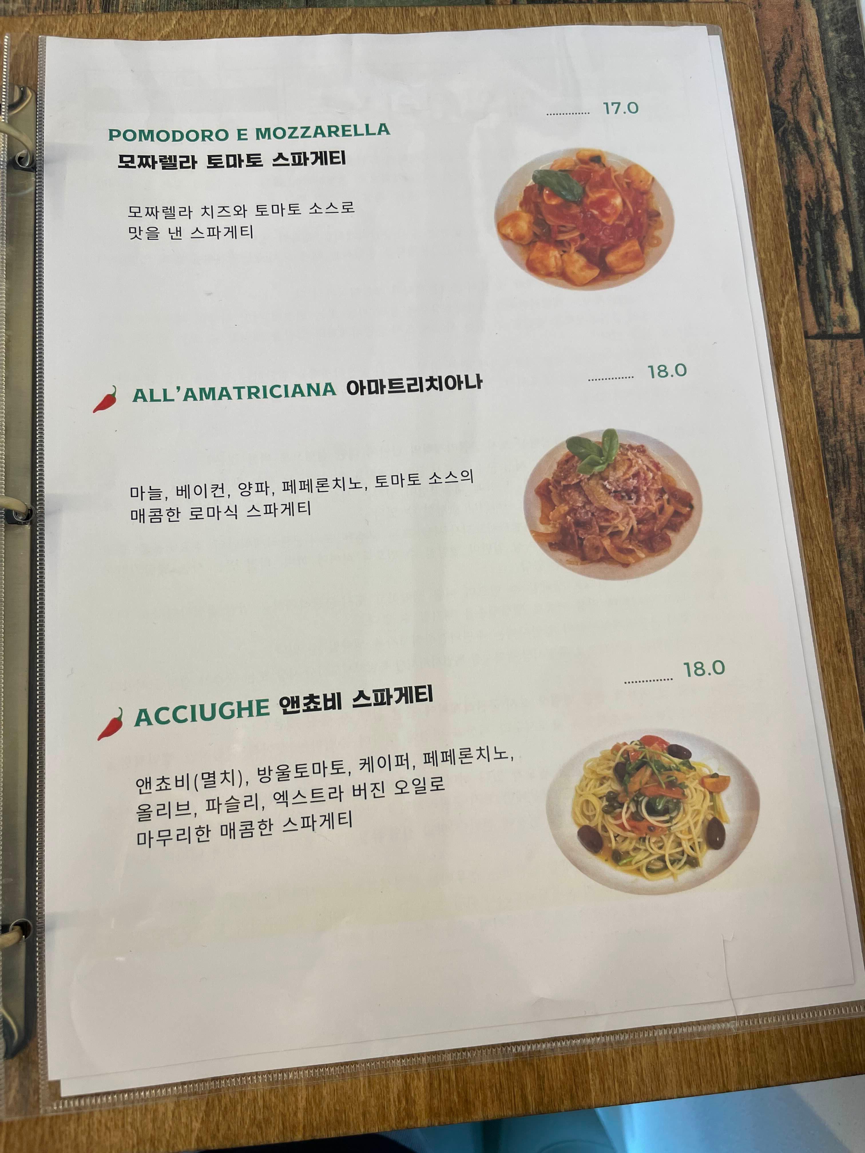 메뉴판은 뭔가 정감이 가고 귀여운 느낌이었습니다. 피자 하나하나 직접 만들어서 메뉴판에 들어갈 사진을 찍으셨을 것을 생각하니, 더욱 귀여운 느낌이었어요. !핏짜! 종류도 9가지나 되었습니다. 익숙한 이름이 있는 반면, 처음 들어보는 이름도 있었어요. 이번에는 뭔가 어렵게 방문한 만큼, 들어보지 못한 종류의 핏짜를 먹어보고자 하였습니다. 스파케티는 핏짜 종류의 1/3 인, 딱 3가지 종류만 있었습니다. 그만큼 이곳이 핏짜 전문점이라는 생각도 들었어요.