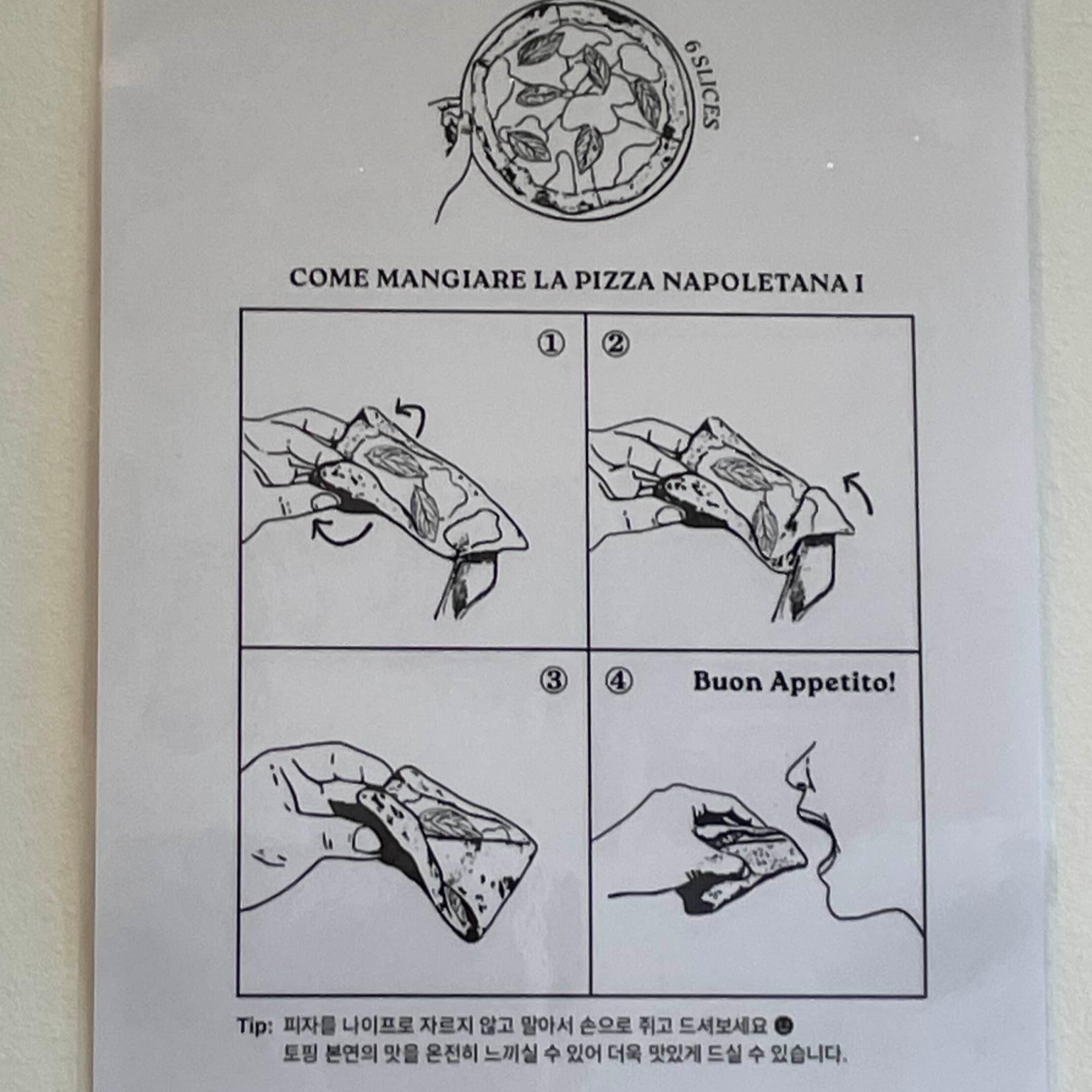 기다리면서 4면의 벽면을 찬찬히 정독을 하였는데요. 그 중에서 이렇게 먹는 방법에 대해서 설명을 해주고 있는 그림을 마주하였습니다. 피자는 이렇게 먹는 것이라는 것을 알려주는 그림이었어요. 저는 귀차니즘 성향이 강해서 손에 뭘 묻히고 먹는 것을 잘 하지 않는 편인데요. 씻으러 다녀와야하니까요. 그럼에도 이렇게 본토의 맛을 느끼기 위해서는 이렇게 먹어야 한다고 강력하게 말해주는 안내문을 보니, 귀찮음을 떨쳐버리지 않을 수 없더라고요.
