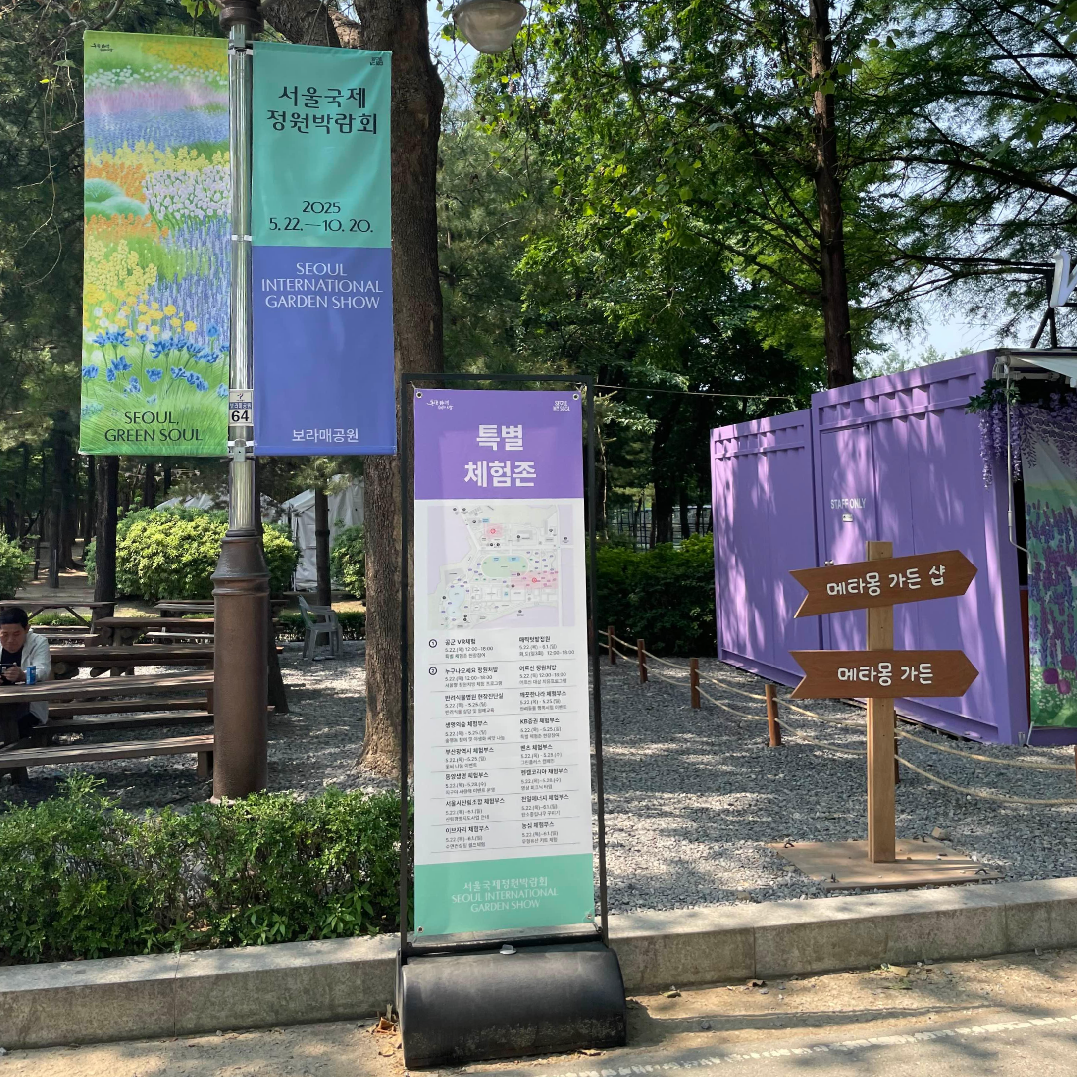 발 아래 안내 문구를 따라 쭉 걸어가다 보면, 곳곳에 휘날리는 <서울 국제 정원 박람회> 배너를 마주할 수 있었습니다. 펄럭거리는 배너들을 따라서 천천히 걸음을 옮기다 보면,