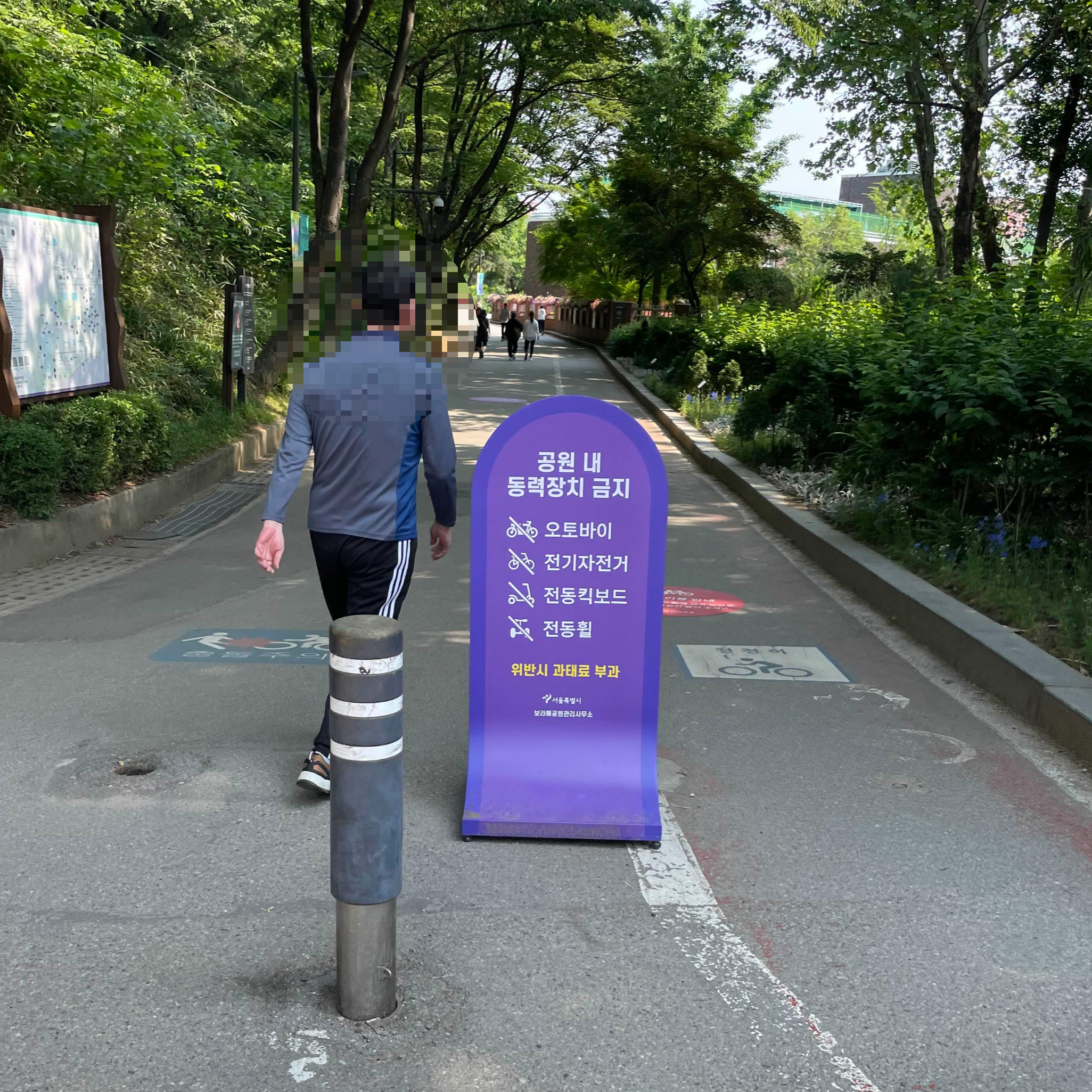 공원 내 동력장치 금지 표지판을 보고 나니 정말 공원 내부에 들어왔다는 것을 실감할 수 있었습니다. 금지된 항목들을 보니, '전자동' 동력 장치를 금지하는 것 같았어요. 일반 자전거, 그러니까 두 발로만 굴러가는 자전거는 자전거 길이 나 있어서 가능한 것으로 보였거든요. 후문의 한적한 길을 둘레둘레 걷다 보니, 그늘의 바람이 참 시원하고 좋았습니다.