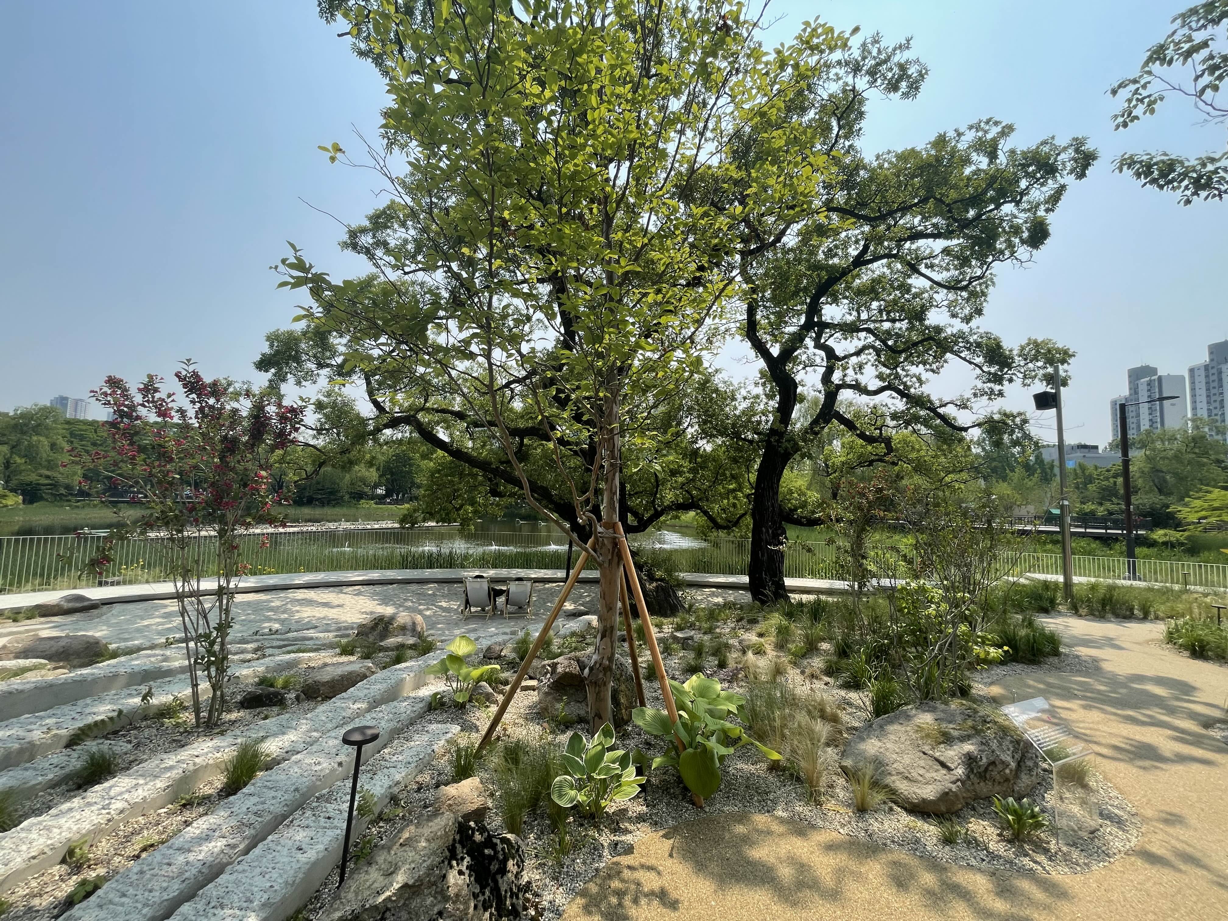 메타몽 가든을 뒤로 하고 한바퀴 둘러보았습니다. 곳곳에 만들어진 정원들이 그들의 대표 이름을 달고 나와서 전시가 되어 있었어요. 각자의 동네 이름을 훈장처럼 매달고 출품이 된 모습을 보니, 이름값이 조금 무겁겠다는 생각이 들더라고요. 그 중에서 시선을 사로 잡았던 건 '부산'의 정원이었습니다. 큰 공간을 하나의 작품으로 만든 정원이었어요. 해변을 연상시키는 바닥재와 하얀 돌을 배치하여 시원한 느낌을 주었습니다. 거기에 큰 나무를 중앙에 배치하여, 더운 태양빛과 나무 그늘의 시원함을 모두 느낄 수 있었던 시간이었습니다. 더군다나 뒤에 호수를 등지고 만들어진 정원은 여름의 시원함을 연상하게 했어요.