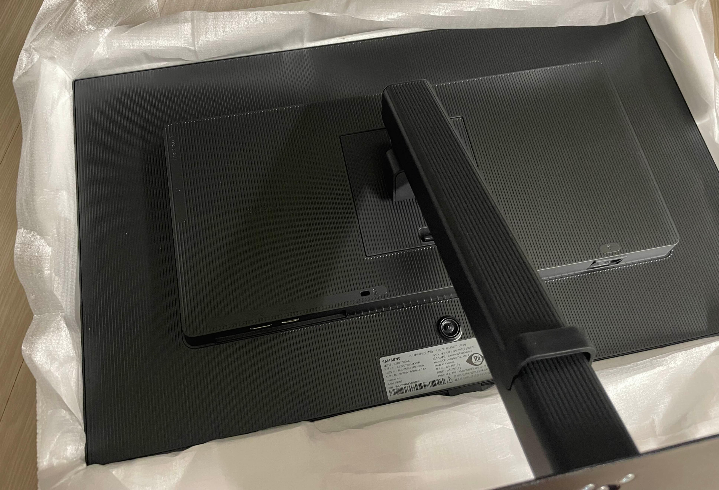 조립이 완료된 스탠드에 모니터 본체를 끼우는 것은 더욱 쉬웠습니다. 모니터 액정이 조금이라도 다치지 않을 수 있도록, 스트로폼 내에 들어있는 상태에서 그대로 스탠드를 가져다가 끼웠습니다. 모니터를 체결하는 전면에 약간의 꺾임이 있는데요. 그 부분을 잘 맞춰서 모니터에 바로 딸깍 하고 끼우면 끝입니다. 굉장히 간단하고 빠르고 쉬웠어요.