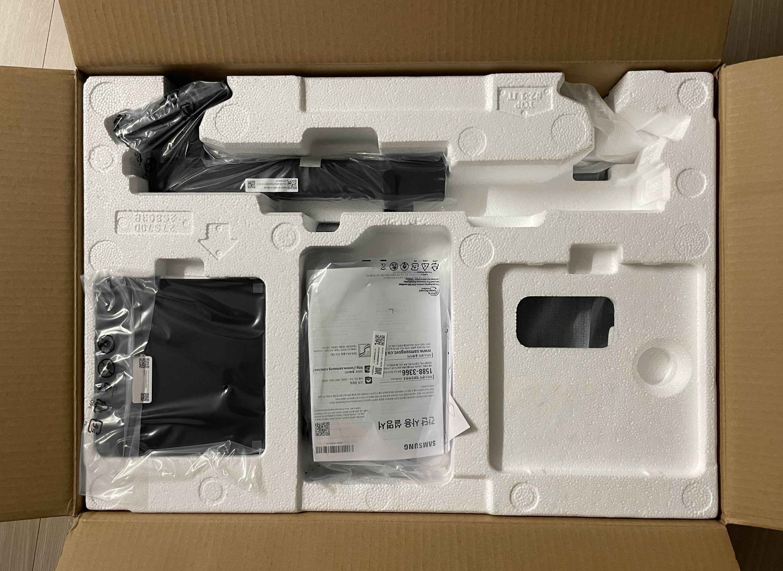 박스 내부는 다음과 같습니다. 모니터를 포함해서 전체 구성품이 스트로폼 내에 잘 포장되어 있어서, 흔들림이나 스크레치 하나 없이 받아볼 수 있었습니다. 역시 대기업의 포장 기술이라고나 할까요. 제품 내부의 포장 상태를 보고, 만족스러웠습니다.