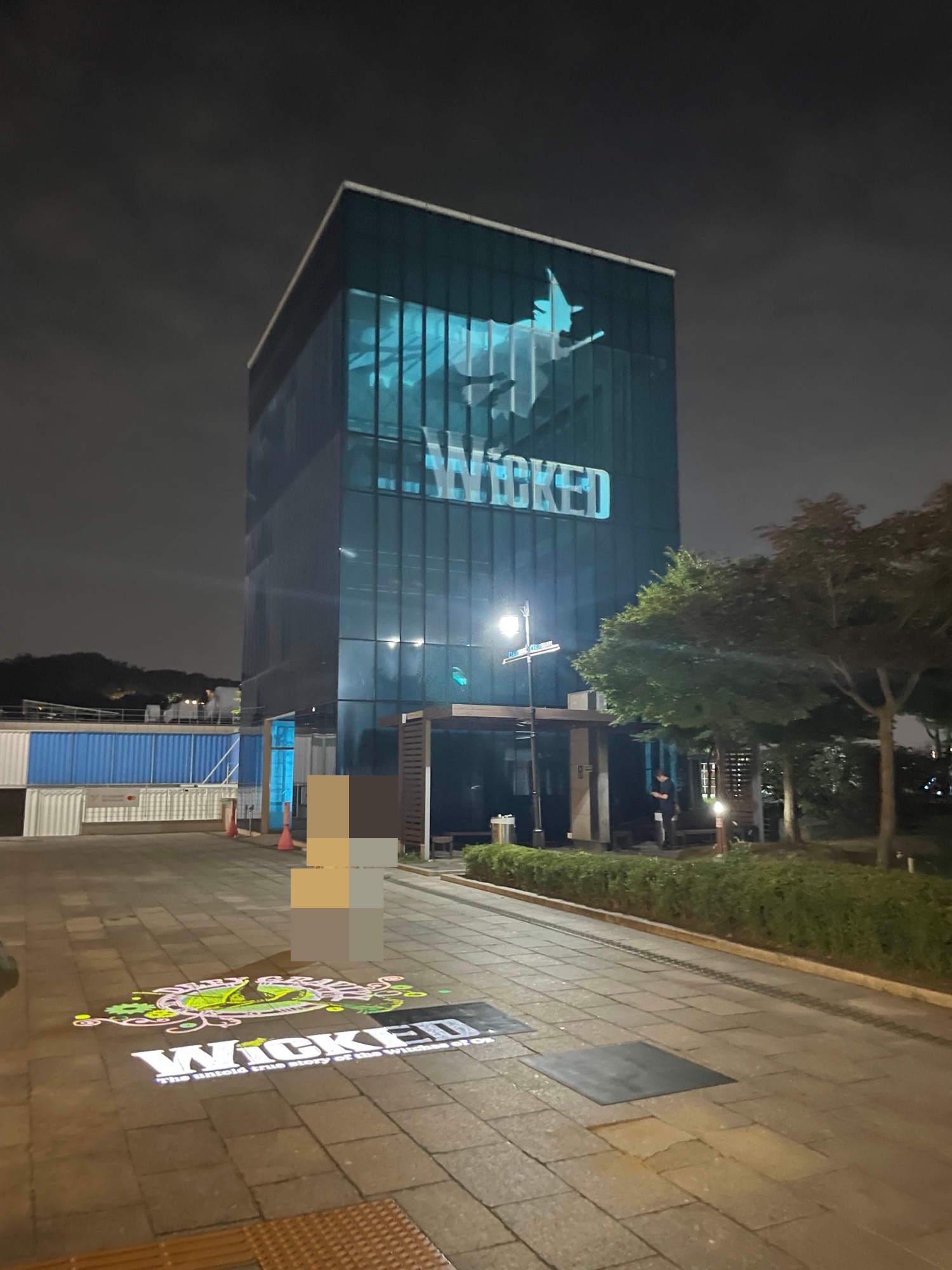 오후 7시 30분에 시작한 공연은 10시 30분 정도에 끝이 났습니다. 밖을 나와 보니, 밝았던 하늘은 어느새 어둠이 내려앉았더라고요. 집에 갈 길이 구 만 리였지만, 그래도 즐거웠다는 감정으로 가득 차서 좋았습니다. 즐거운 하루의 마무리였어요. 버스정류장을 가는 길에 건물을 돌아보니, 정말 온통 <위키드> 더라고요. 빛으로 마녀가, 알파바가 날아가는 듯한 조명이 마음에 들었습니다.