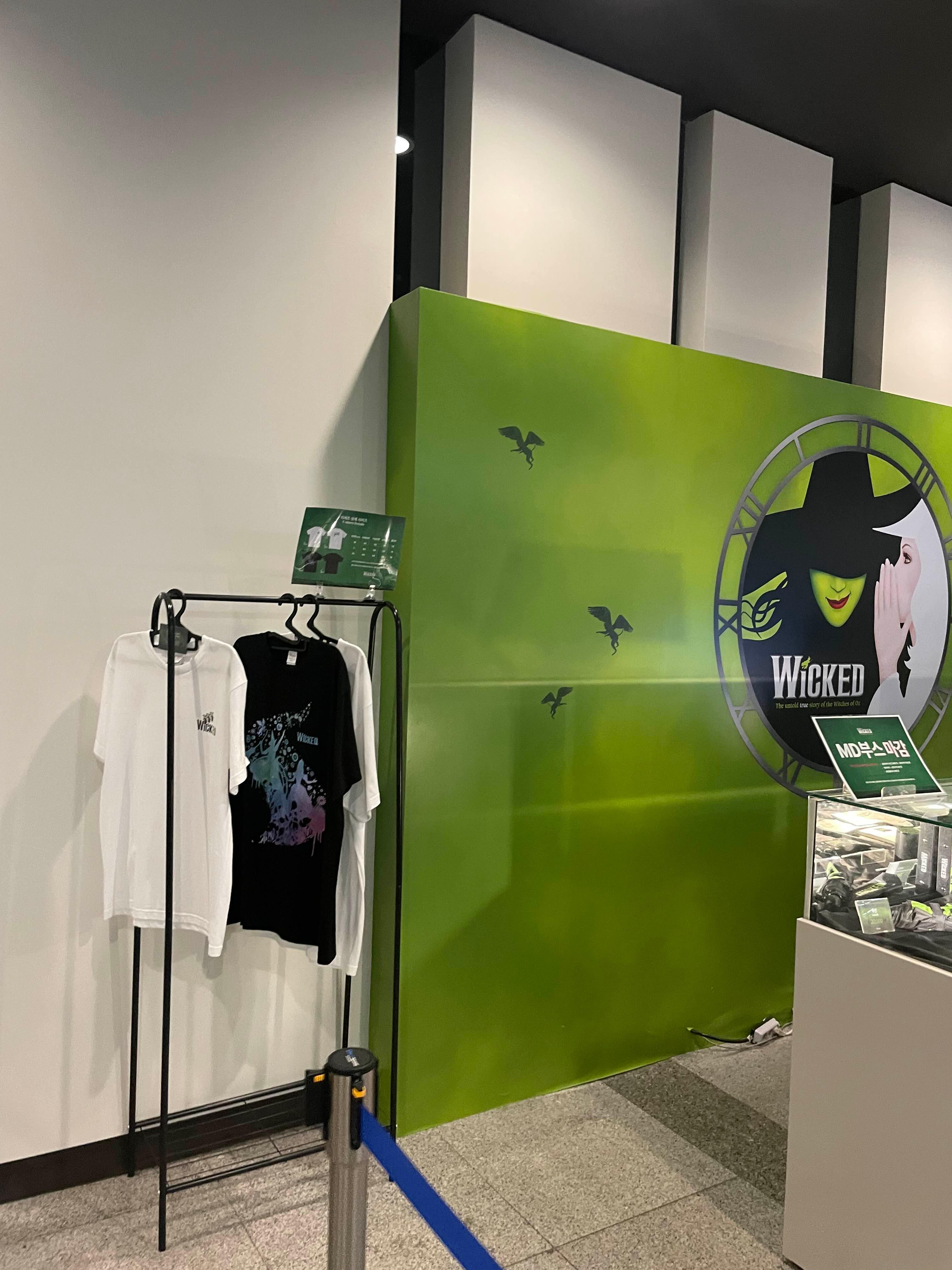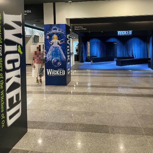 아, 블루스퀘어 신한카드홀 이었군요. 아무튼 여기가 처음에 어떻게 되어 있었는지 생각이 안 날 정도로 온통 위키드 천국이었습니다. 내부, 외부 어디 하나 할 것 없이요! 기둥마다 위키드가 있고, 벽은 온통 초록 빛깔 이었어요. 그래서 여기는 위키드에 진심이구나 생각이 들었습니다. 위키드 내한 공연 때까지는 이렇게 꾸며진 채로 남아있지 않을까 싶어요:)
