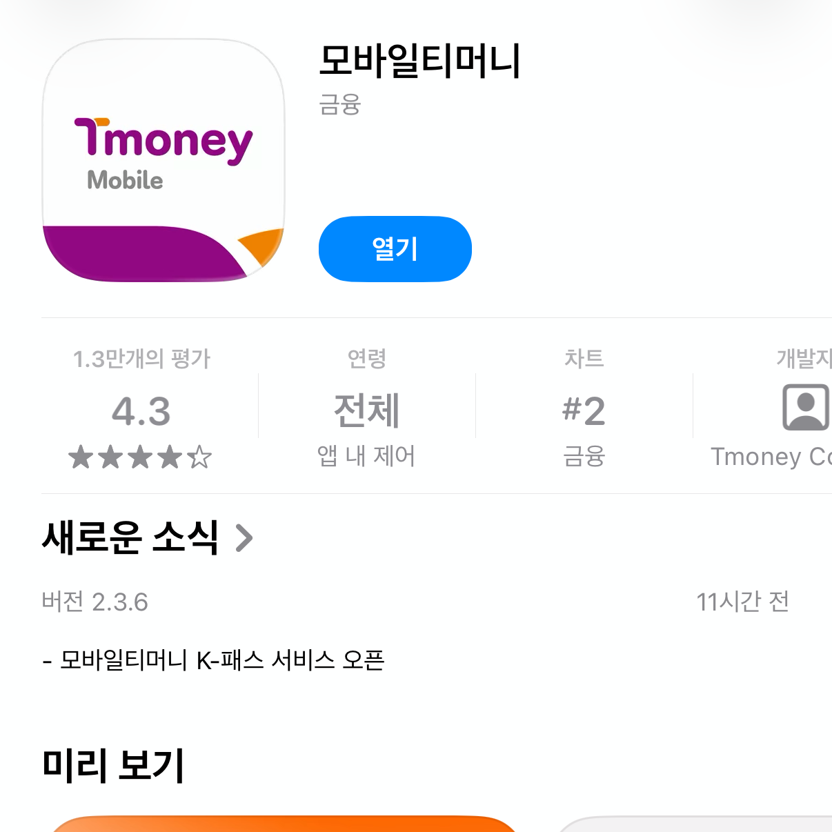 가장 먼저, <모바일티머니> 어플을 다운 받아줍니다. 새로운 소식에 "모바일티머니 K-패스 서비스 오픈" 보이시죠? 이제 된다는 거예요.