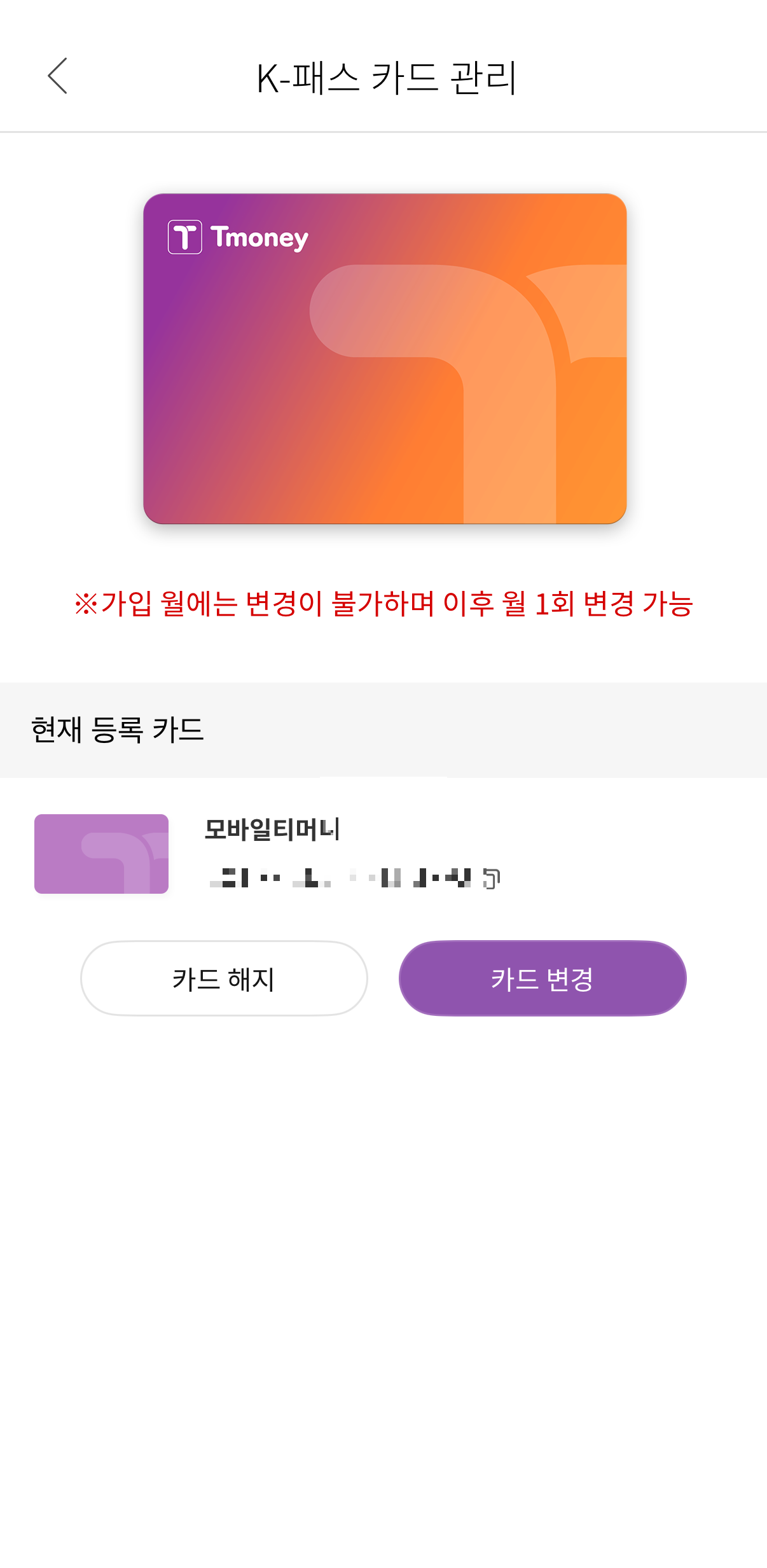 아래와 같이 기존의 하나카드가 티머니카드로 변경된 모습을 확인해 볼 수 있습니다.