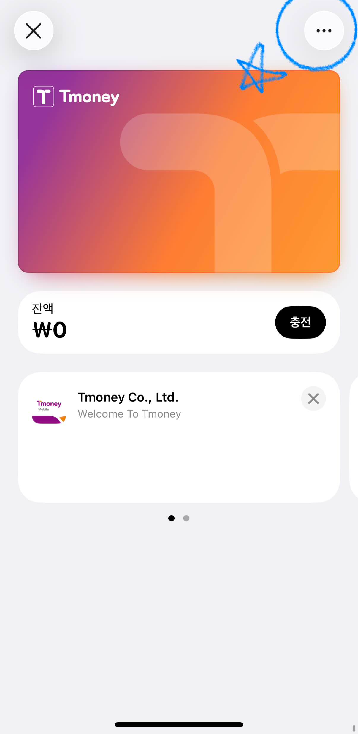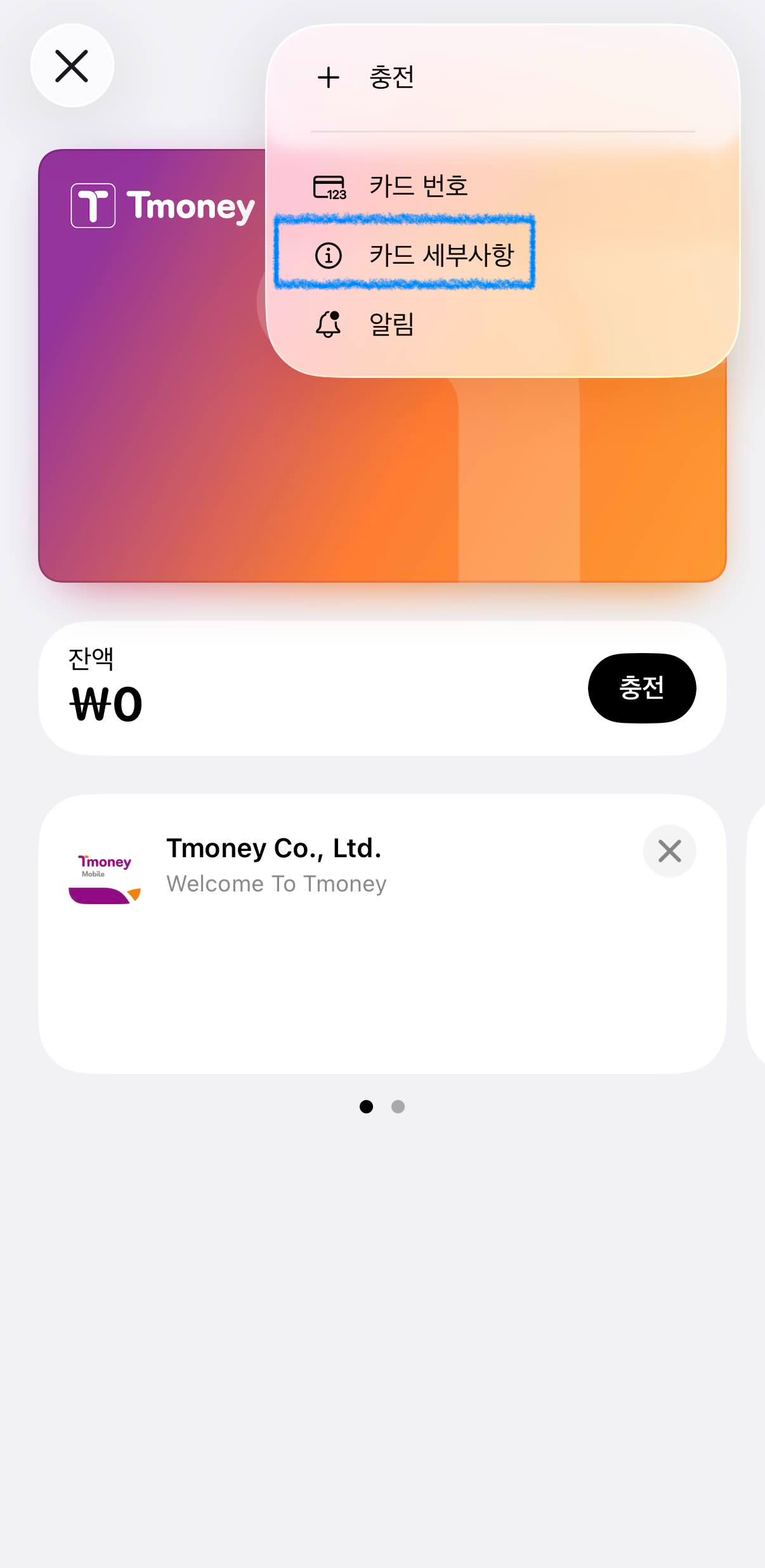 삭제할 티머니 카드를 하나 선택해줍니다. 해당 카드의 상세화면 중 우측 상단에 ... 을 선택하면 다음과 같이 세부 메뉴가 노출됩니다.
