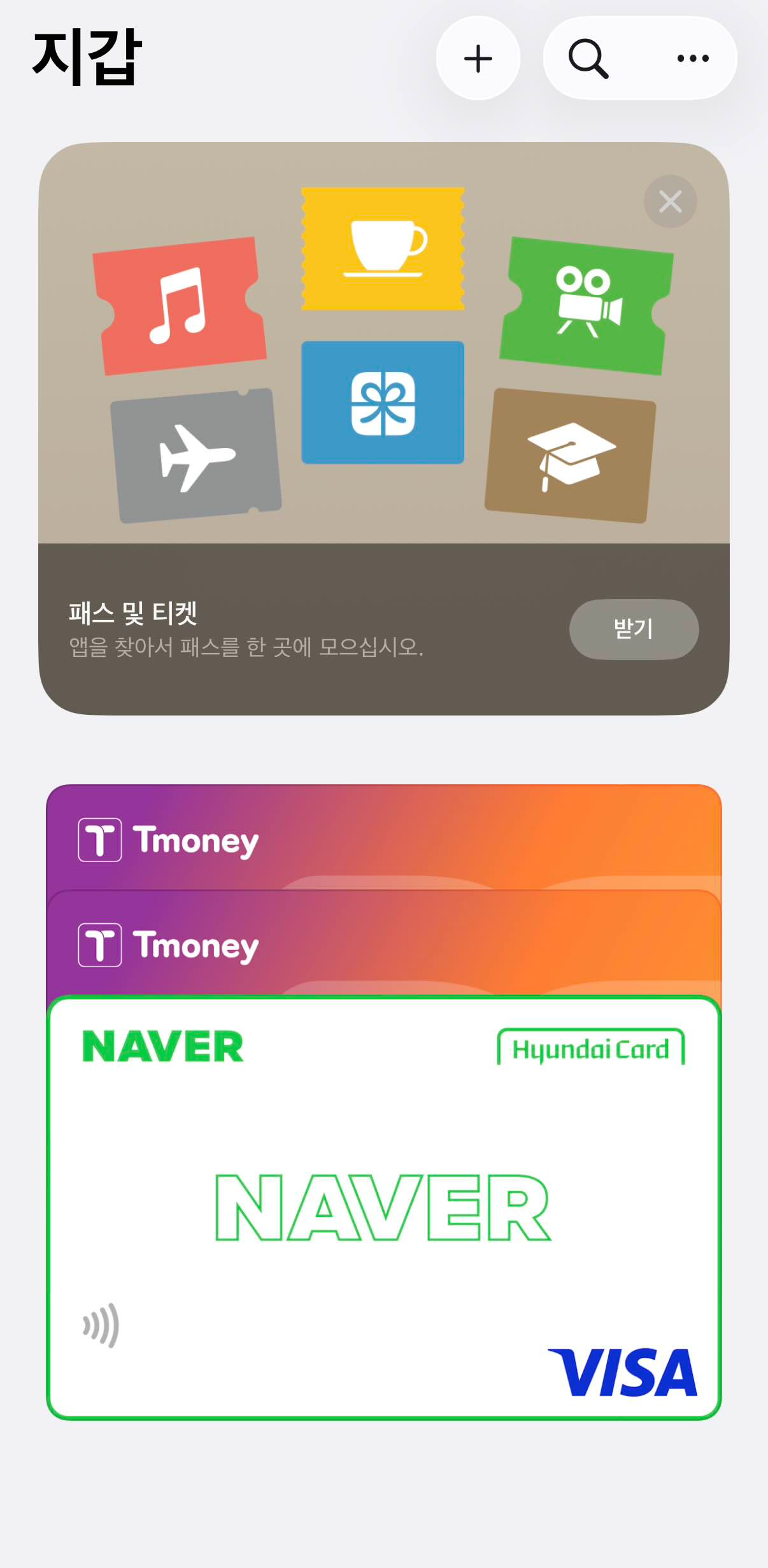 저는 기존에 네이버 현대카드를 사용하고 있었기 때문에 네이버페이가 가장 먼저 노출되고, 그 뒤로 방금 등록한 모바일 티머니가 줄줄이 나오고 있습니다. 처음 등록 후 추가 캡쳐를 위해서 하나 더 등록을 하게 되면서 여러개가 등록이 되게 되었는데요. [모바일티머니] 어플 내에서 현재는 애플 페이에 등록하는 티머니 카드를 계속해서 생성이 가능한 것 같더라고요. 어차피 충전해서 사용해서 그런 것인지 페이 등록 자체는 제한 없이 가능한 것 같았습니다. (아 물론 끝은 있을 수 있어요. 저는 하나만 되는 건 아니라는 말씀이었습니다.)