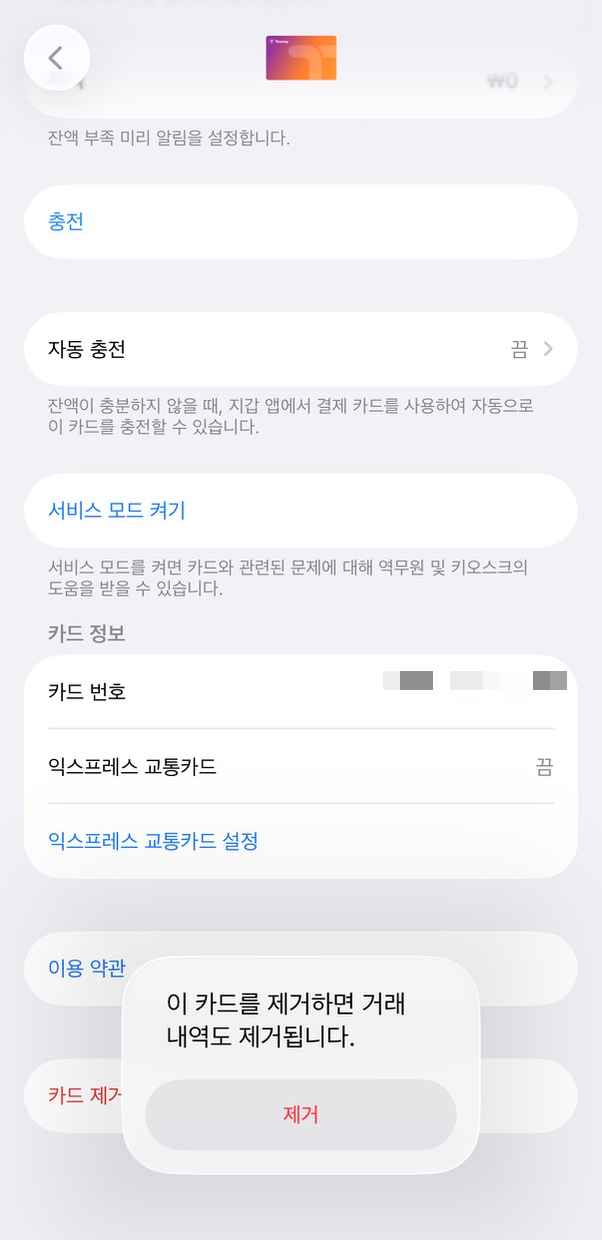 Apple Pay 모바일 티머니 카드 삭제하기