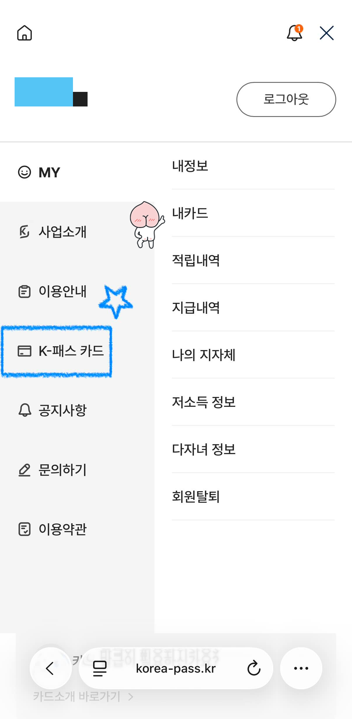 메뉴에 들어가면 다음과 같은 세부 메뉴를 확인할 수 있는데, 여기에서 <MY - 내카드> 에 들어가시면 현재 등록된 K-패스 카드를 확인할 수 있습니다. 아래 화면에서 별표가 붙은 <K-패스 카드>는 함정입니다. 어피키가 가리키고 있는 곳으로 들어가주세요.