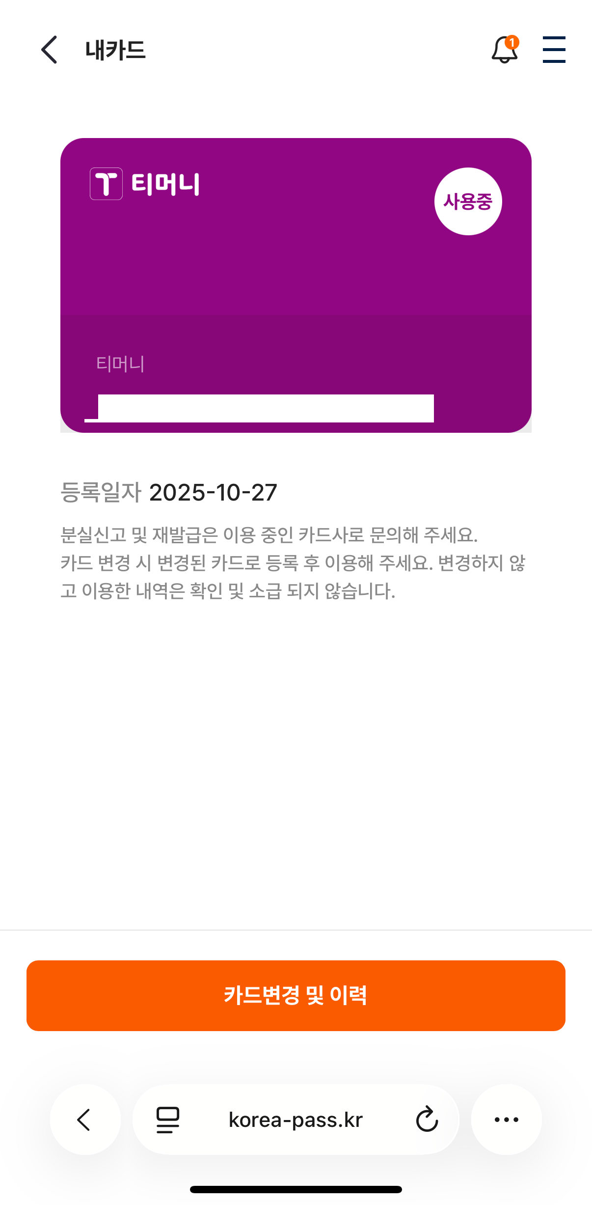 해당 메뉴에 들어가면 다음과 같이 기존에 등록된 카드를 확인할 수 있습니다. 저는 기존에 하나카드 K-패스 를 사용하고 있었어서, 해당 카드가 등록된 것을 확인할 수 있었습니다. K-패스가 시작된 그날부터 쭉, 하나카드로만 사용하고 있었습니다. 이제 <모바일티머니> 카드로 바꿔주기 위해서, 하단에 <카드변경 및 이력> 버튼을 클릭해줍니다.
