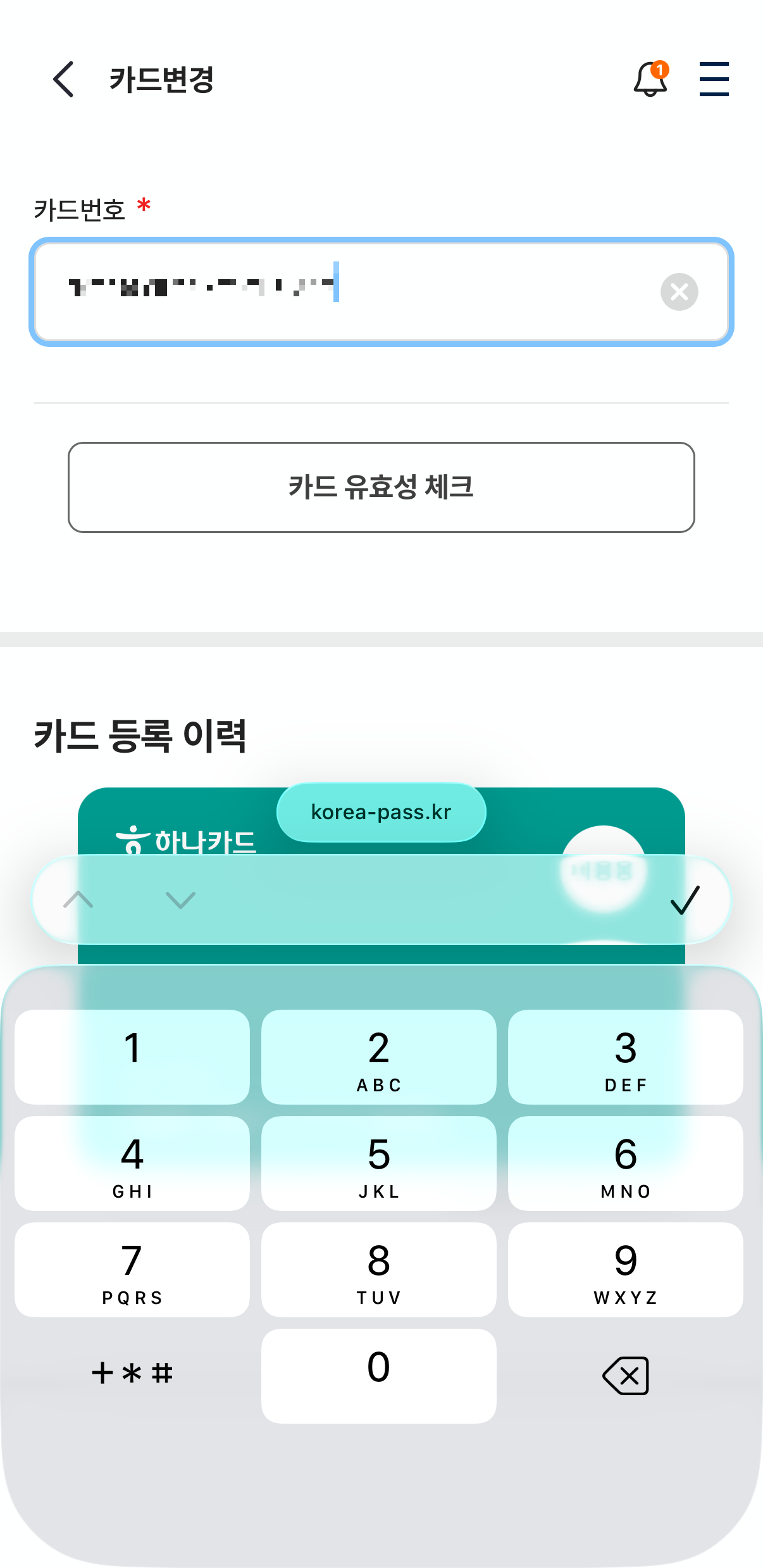 해당 메뉴를 클릭하면, 카드번호를 기입하고 <카드 유효성 체크>를 진행하여, 실제 사용이 가능한 카드인지 확인과 동시에 해당 카드로 변경됨을 확인할 수 있습니다.