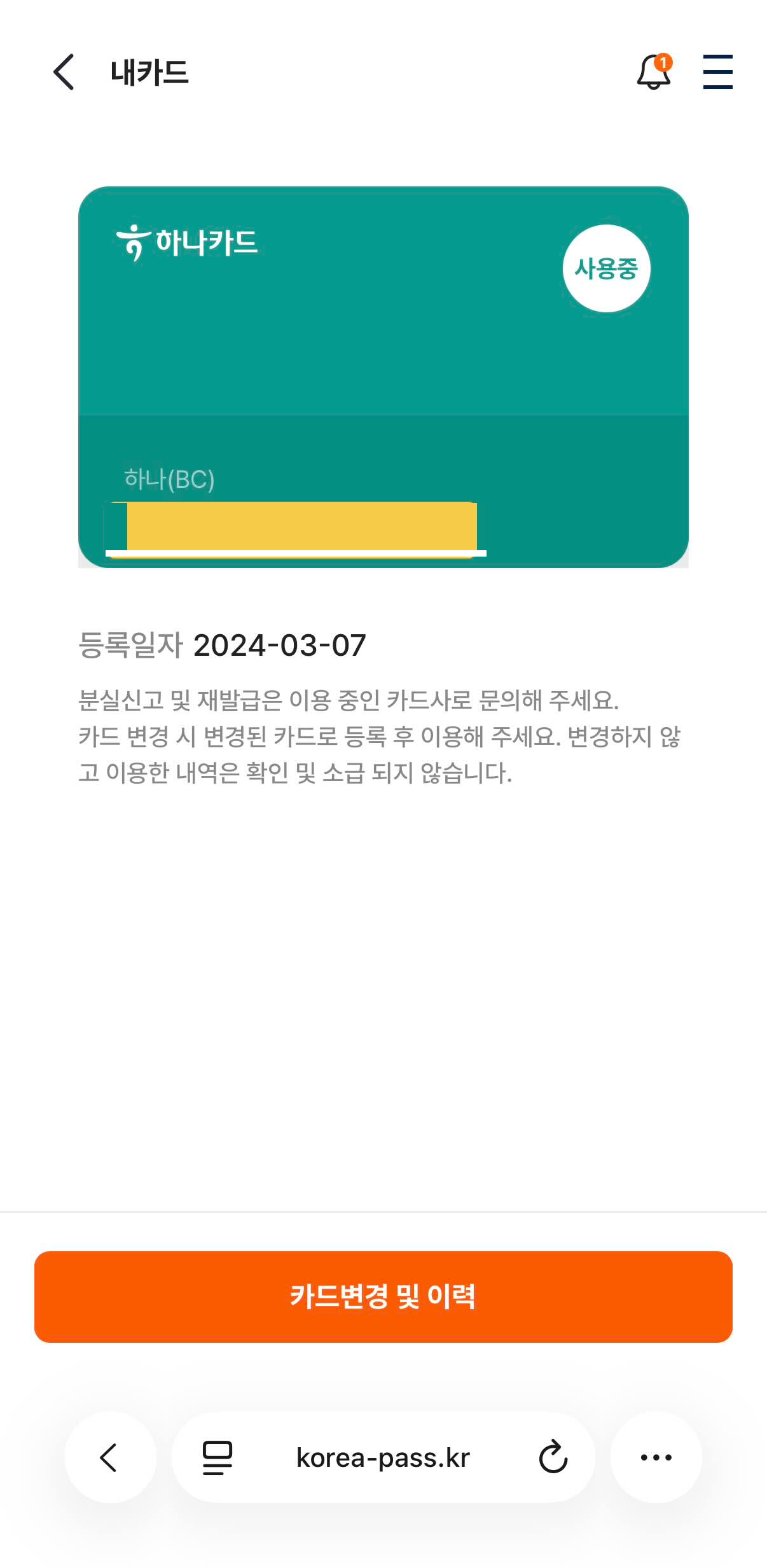 해당 메뉴에 들어가면 다음과 같이 기존에 등록된 카드를 확인할 수 있습니다. 저는 기존에 하나카드 K-패스 를 사용하고 있었어서, 해당 카드가 등록된 것을 확인할 수 있었습니다. K-패스가 시작된 그날부터 쭉, 하나카드로만 사용하고 있었습니다. 이제 <모바일티머니> 카드로 바꿔주기 위해서, 하단에 <카드변경 및 이력> 버튼을 클릭해줍니다.