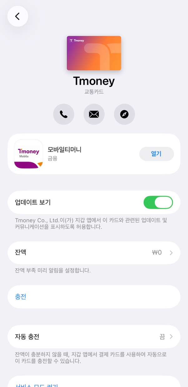 Apple 지갑에 추가되었다는 내용을 확인한 후, 다시 [모바일티머니] 어플에 접속하면, 이렇게 티머니 카드가 생성되었음을 확인할 수 있습니다.