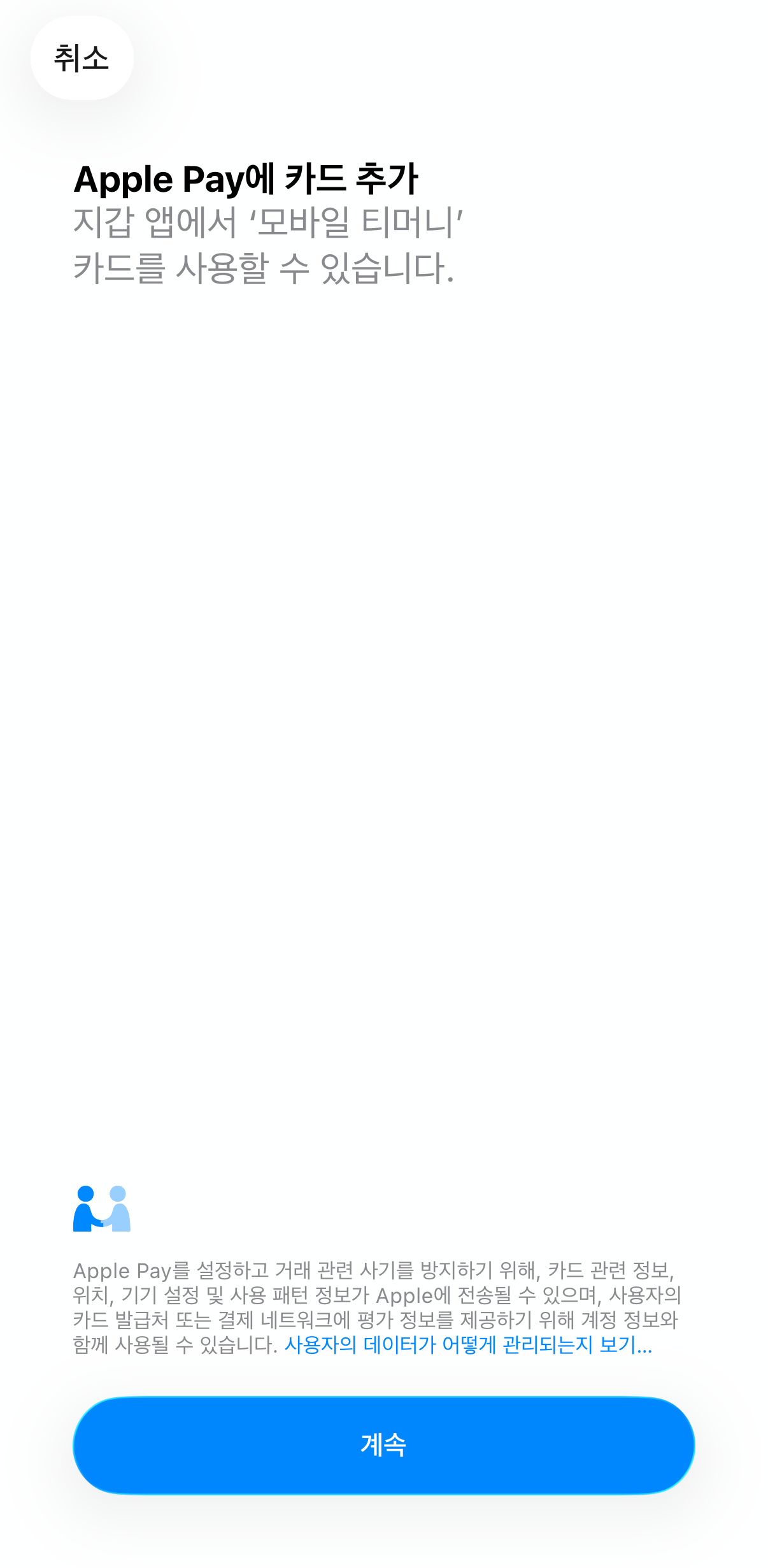 해당 버튼을 클릭함과 동시에, Apple Pay에 '모바일 티머니' 카드를 추가하는 작업이 진행되고, 계속 버튼을 누르게 되면,