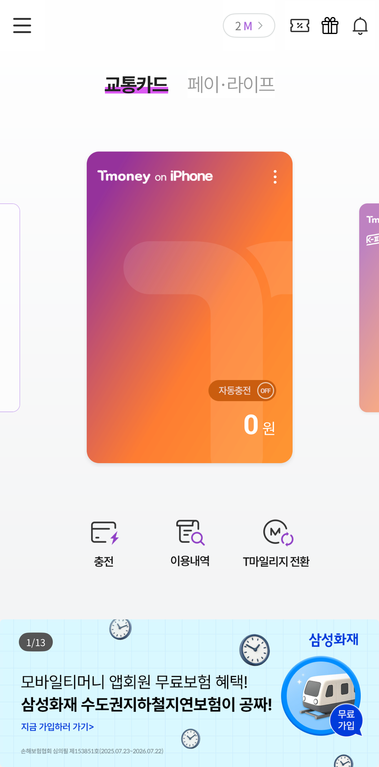 아래와 같이 기존의 하나카드가 티머니카드로 변경된 모습을 확인해 볼 수 있습니다.