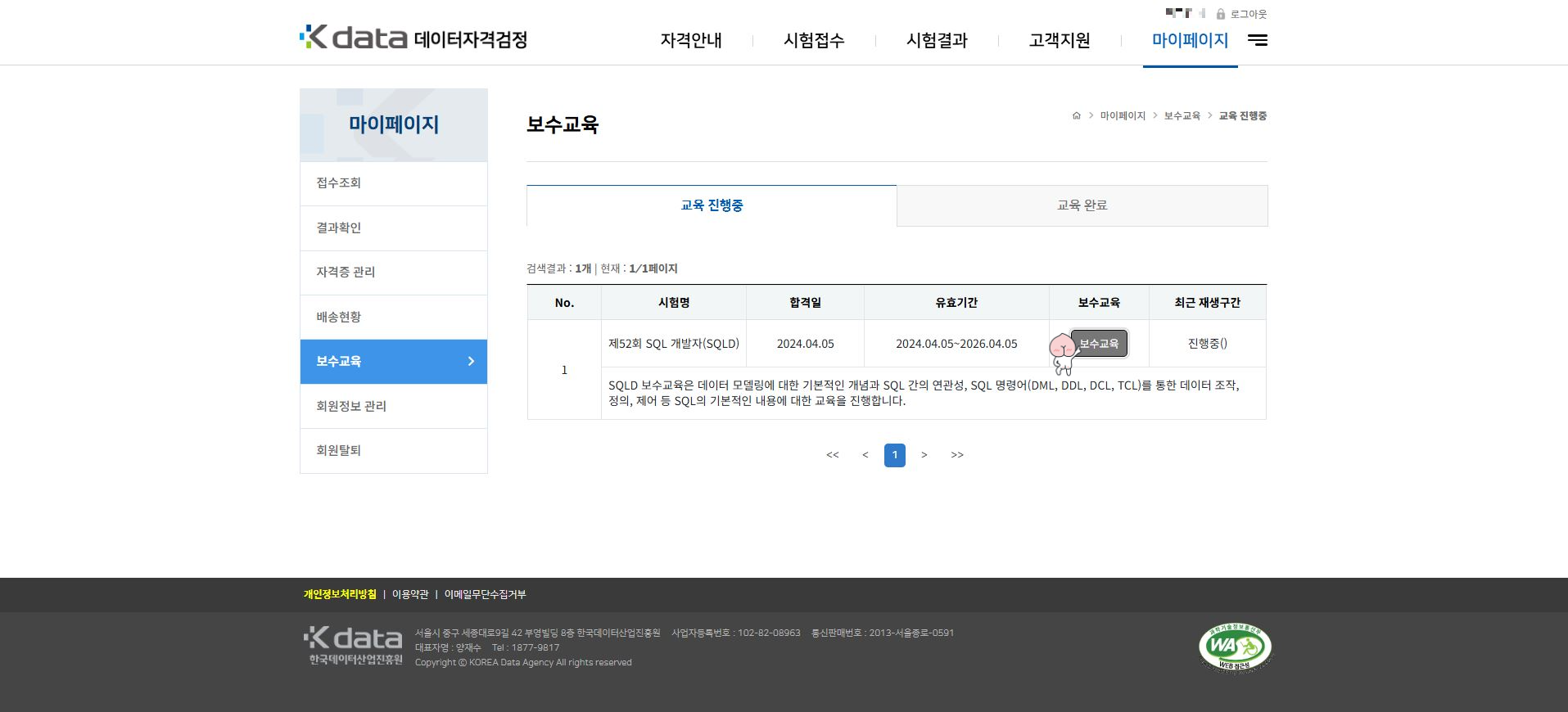 동일한 <마이페이지> 메뉴의 하위 메뉴 중 <보수교육>이라는 메뉴가 있습니다. 해당 메뉴를 클릭해서 들어가 보면, 아래와 같이 보수 교육을 받을 수 있는 자격증이 나와요. SQLD의 자격증의 유효기간이 있고, 그 옆에 <보수교육>을 받을 수 있는 버튼이 활성되어 있습니다. 해당 버튼을 누르면 인터넷 강의 창이 노출됩니다. 대략 한 시간 정도의 강의인데, 해당 강의를 끝까지 들으면 끝납니다!