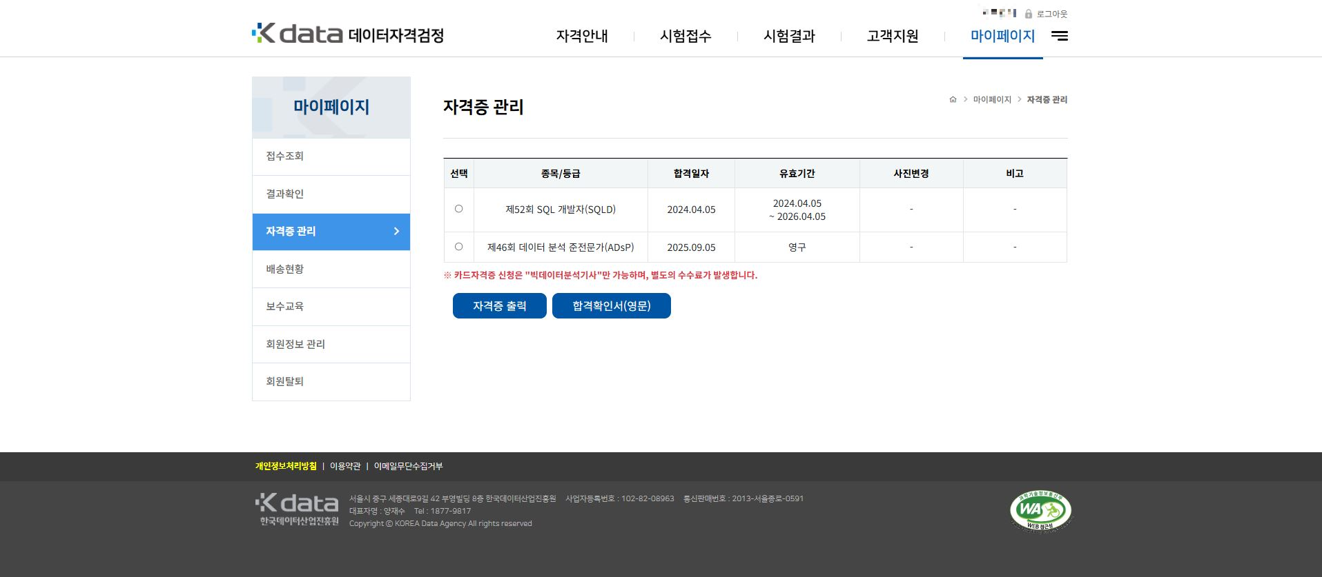 마지막으로, 다시 처음에 확인했었던 <자격증 관리> 메뉴에서 확인을 해보았습니다. 정말로 SQLD 자격증이 "영구"로 변경이 되었는지 확인해보기 위해서요. 기대를 저버리지 않고 기간이 잘 바뀐 것을 확인해 볼 수 있었습니다:)