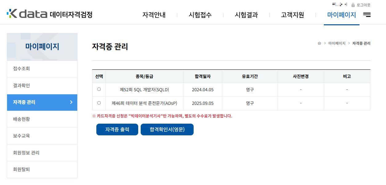 <자격증 관리> 메뉴에 들어가면 아래와 같이 보여집니다. 아무도 모르게 ADsP 자격증도 따둔 모습을 볼 수 있는데요. 아래 화면에서 SQLD 자격증의 경우 유효기간이 2년으로 정해져있는 것을 볼 수 있습니다. ADsP는 영구적인데요. 자, 이제 이 SQLD 자격증을 영구적으로 가져보겠습니다.