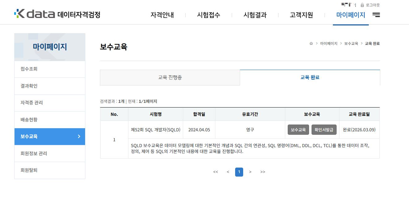 그리고 교육을 모두 마치면, 아래와 같이 <교육 완료> 탭으로 넘어가게 되고, 교육 완료일을 확인할 수 있습니다. 그리고 드디어, SQLD 자격증의 유효기간도 "영구"로 바뀌게 돼요.