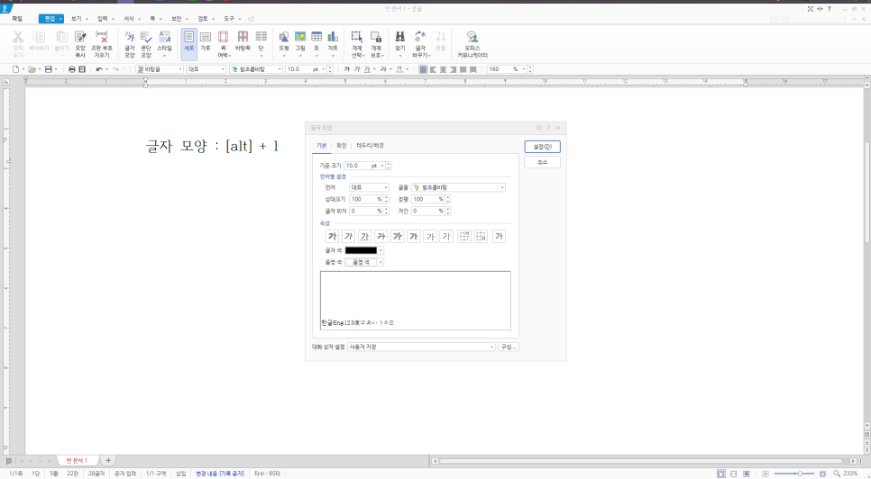 '글자 모양'은 말 그대로 현재 사용하고 있는 글자의 모양을 관리할 수 있는 곳입니다. 단축키를 통해서 들어가면 보다 쉽고 간편하게 글자 모양에 대한 세부 설정을 관리할 수 있습니다.