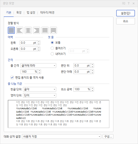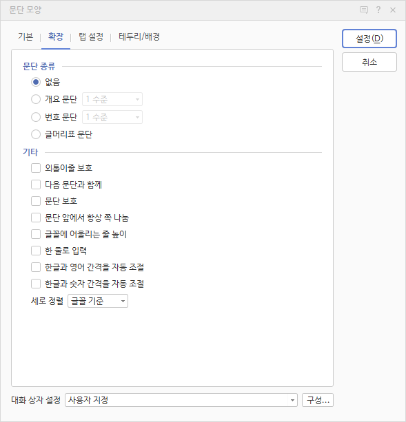 문단 종류를 나누거나 문단의 자세한 부분을 다룰 수 있는 공간입니다. 줄 높이를 조절하게 한다거나 문단과 문단 사이의 쪽을 나누게 한다거나 그러한 설정을 할 수 있는 곳입니다. 하지만 저는 [확장] 탭은 정말 거의 사용하지 않는 것 같아요.