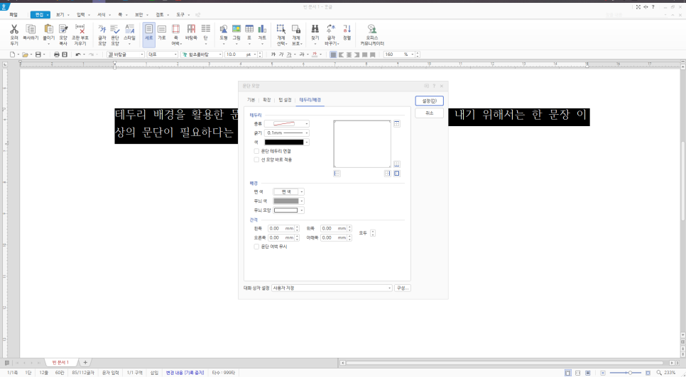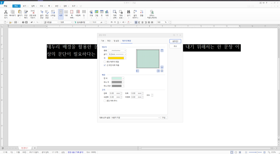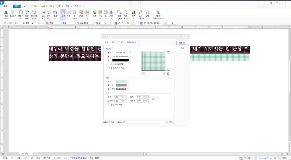 [글자 모양]에서와 마찬가지로 네모 상자와 그 안의 색과 무늬를 넣어주는 설정인데, 여기서는 [문단 모양]이기 때문에 네모 상자의 기준이 문단이 됩니다. 그래서 한 문단을 기준으로 색과 무늬 그리고 테두리를 설정할 수 있습니다.