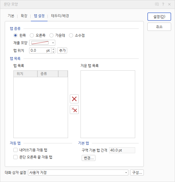 [tab] 단축키를 어떻게 할지 결정하는 공간입니다. [한컴]에서 [tab] 단축키를 사용하면 큼지막한 띄어쓰기가 되잖아요. 그 간격을 조절한다거나 제가 이전에 포스팅한 것 처럼 점선을 넣는다거나 그렇게 [tab] 단축키를 활용하는 공간입니다. 해당 포스팅은 아래 링크를 참고해주세요:)