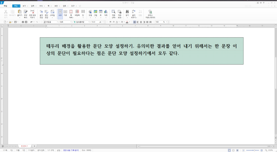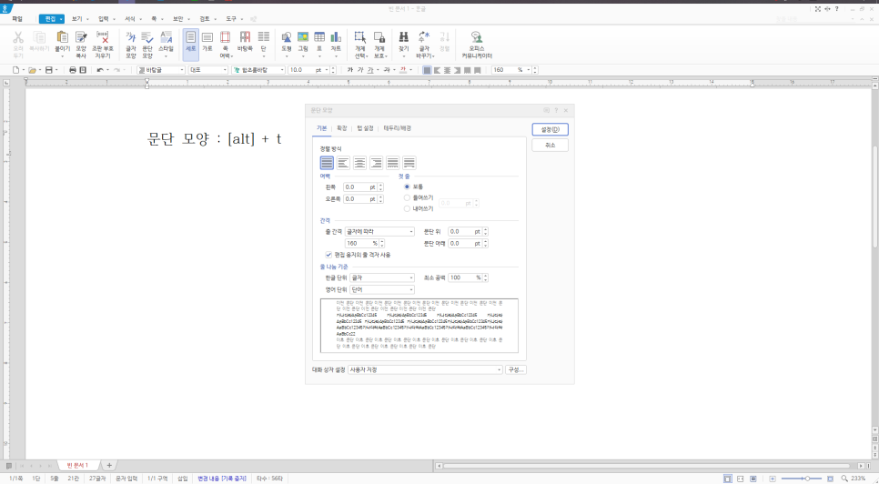 [문단 모양 단축키] : [alt] + t (영소문자 t)