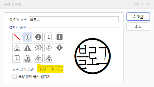 저희는 '원형 만들기'가 목적이기 때문에 가장 처음에 있는 [원 문자]를 선택하고 [넣기]를 눌러줍니다. 그러면 아래와 같이 원 안에 필요한 글자가 들어간 모습을 확인해볼 수 있습니다.