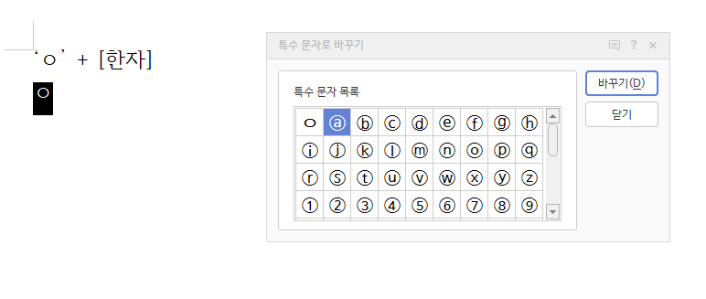 먼저, 한글 자음 'ㅇ'을 이후 '한자' 키를 눌러서 특수문자로 만들면 영어 소문자와 숫자의 원형문자가 나옵니다.