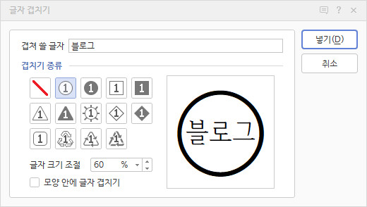'글자 겹치기' 팝업을 보시면 아시겠지만, '원 문자' 말고도 네모, 세모, 마름모 등 다양하게 문자를 도형 안에 넣을 수 있습니다.