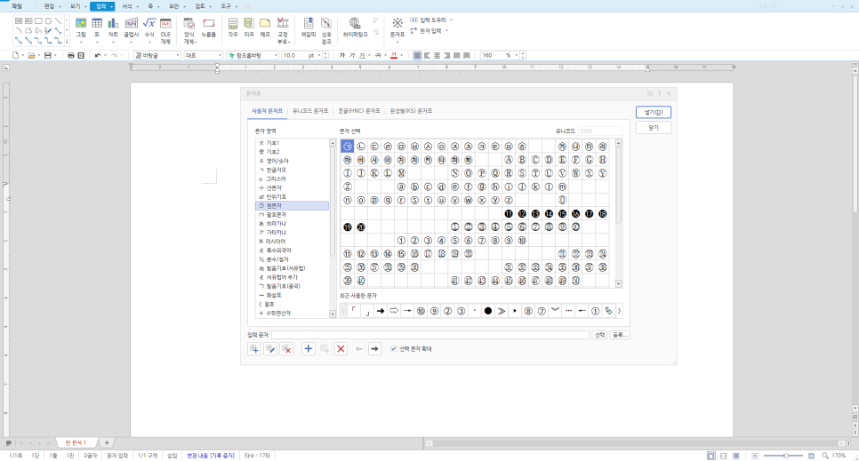 이 외에도, 'ctrl + f10'으로 들어간 문자표 안의 '원문자'에서 다양한 원문자를 사용할 수도 있습니다.