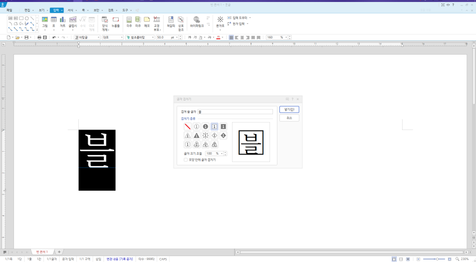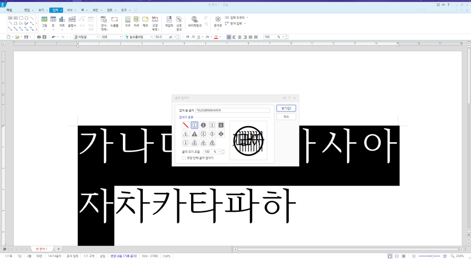 '글자 겹치기'까지 누르면 다음과 같은 팝업창이 뜹니다.
