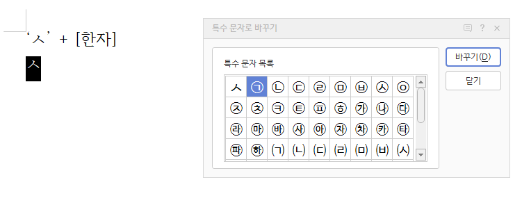 한글 자음 'ㅅ'을 이후 '한자' 키를 눌러서 특수문자로 만들면 한글 자음과 한글 글자 몇몇의 원형 문자가 나옵니다.